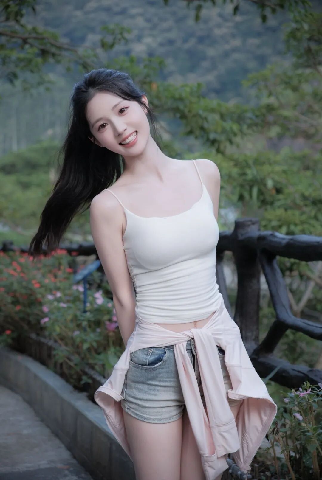 身体微微侧靠,露出甜美灿烂的笑容,整个人看起来温柔又迷人。这个姿势能很好地展现脸部的柔美线条,笑容的感染力也能通过这个姿势更好地传递出来,在户外的环境中,仿佛能让人感受到那份轻松愉悦的心情。