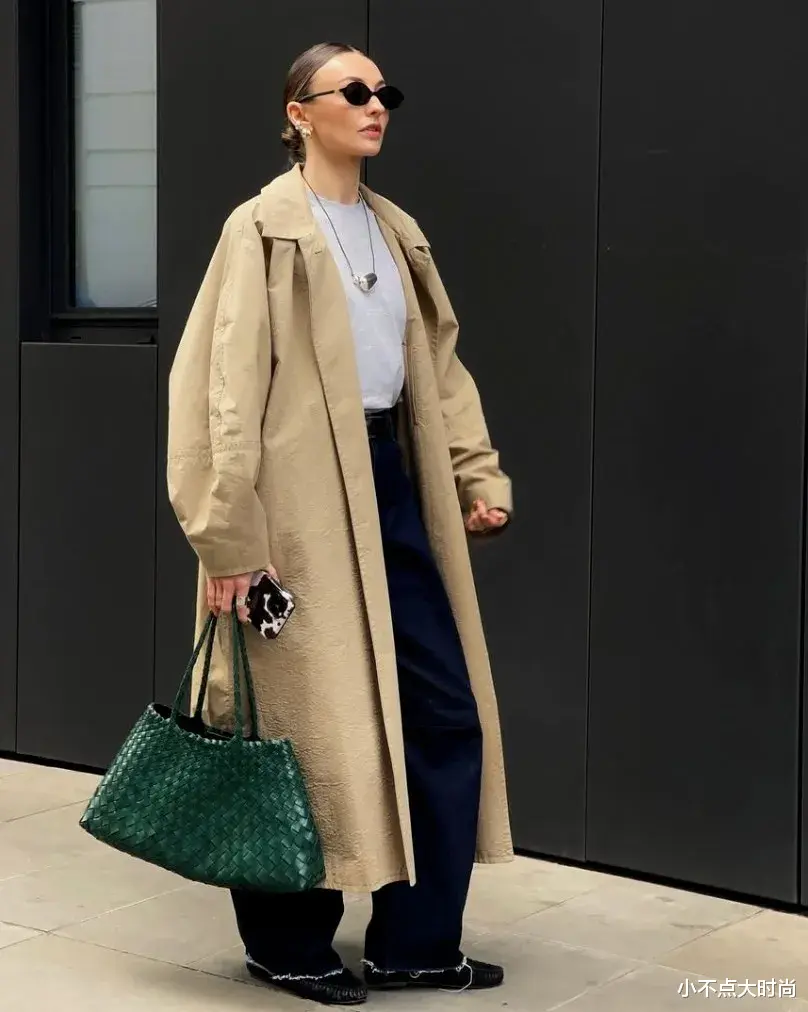 穿长款的风衣外套,也会利用内搭来显高,内搭白色T恤、高腰蓝色牛仔直筒裤,提高腰线,视觉显高,飒爽的风衣小个子也能驾驭得很好,利落大方,简约时髦。▼