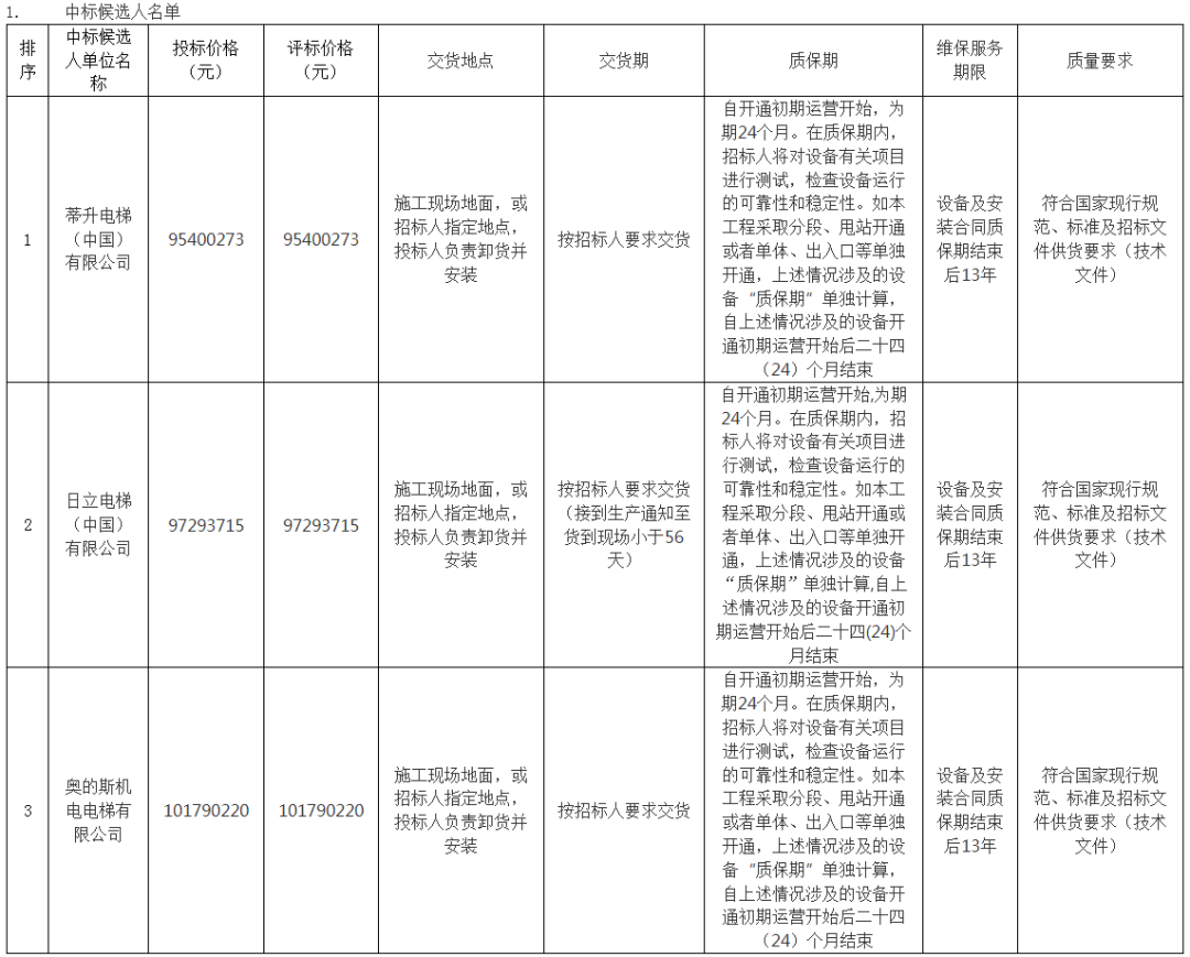 *供货+安装+维保”一体化服务: 本次招标明确要求包含供货、安装及维保。蒂升作为大型制造商,拥有覆盖全国的强大工程安装团队和完善的售后服务体系(维保网络、备件供应、技术支持)。