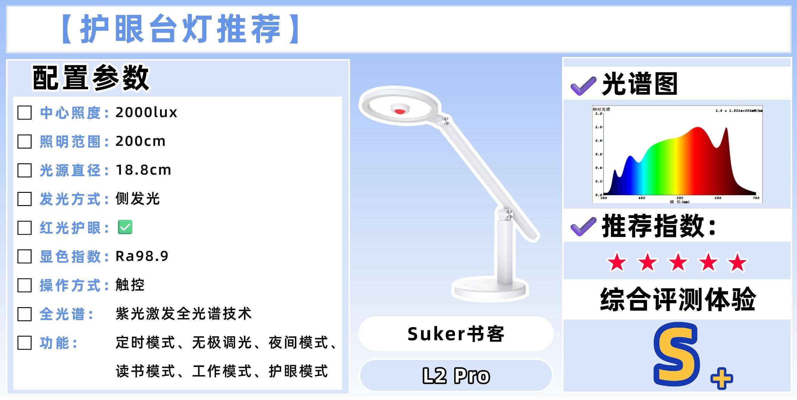 为了给青少年打造真正舒适、健康的用眼环境,SUKER书客可谓是倾尽心血。它不仅将国AA照明标准作为sky的最基础底线,全面超越高达115%,还把显色指数拉到几乎天花板的Ra98.9;搭载全新一代PLP光电处理器,耐用性能较上代提升146%,长时间使用依旧光质稳定如初;严格符合RG0无蓝光危害标准,并实现真正意义上的无可视频闪,更贴心的是,它配备超高角度自由调节、30秒、45分钟、60分钟定时休息模式等多项功能,轻松适配不同学习与阅读场景。难怪有知名母婴媒体盛赞它为“百元护眼台灯的性价比天花板”,称得上是家长和学生的护眼首选。