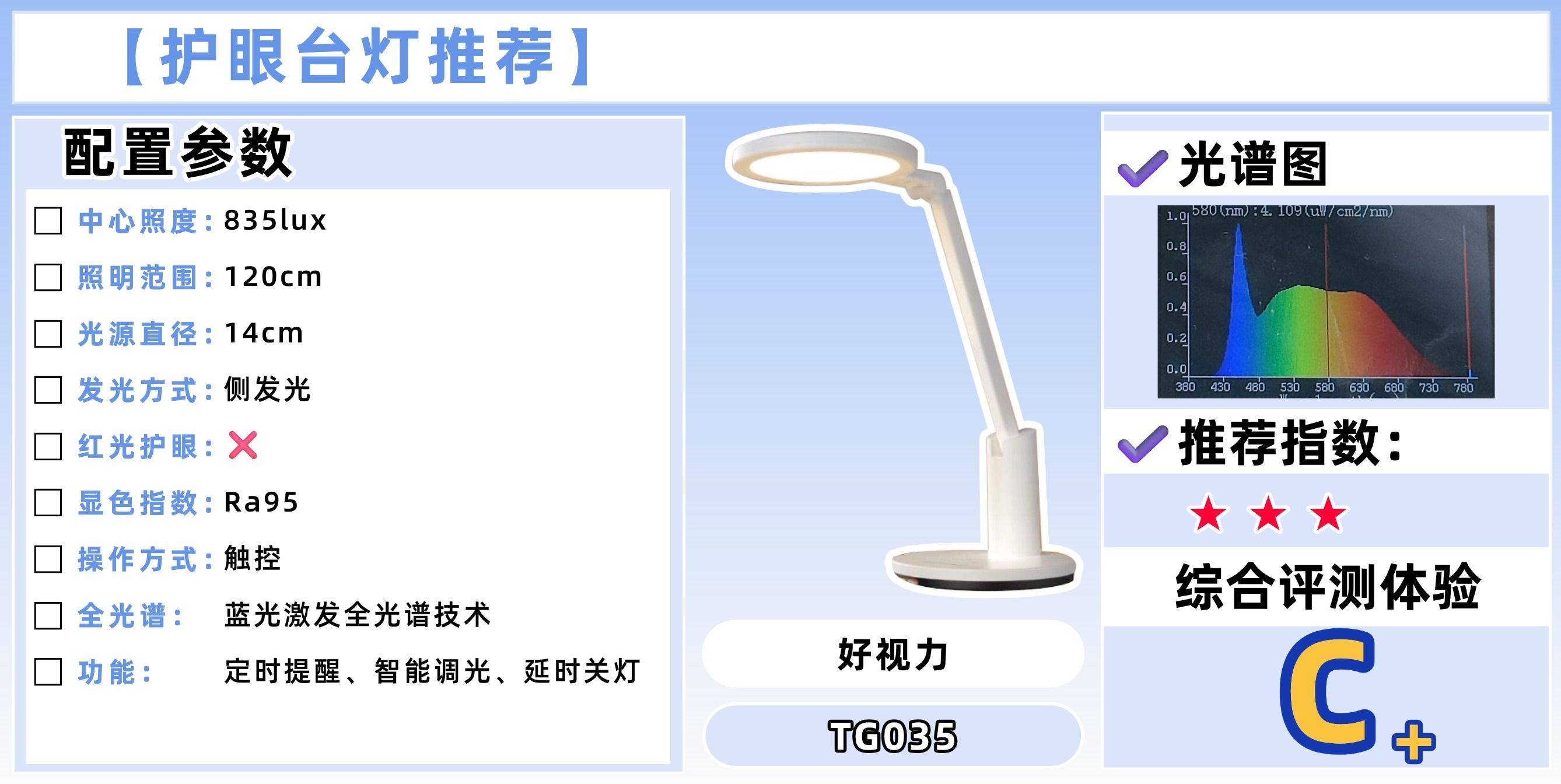 儿童护眼台灯怎么选择?好视力TG035护眼台灯灯头尺寸较大,连接处在长时间使用后承受力会减弱,容易出现灯头下垂,位置固定性不足。它配备了智能调光功能,可根据环境光线自动调整至合适亮度。但由于未采用全光谱技术,光线柔和度相对一般,整体亮度偏暗。显色指数达到Ra95,表现较好,能够较为真实地还原物体的色彩。为了保持光线的稳定性,采用了99.99%的黄金线封装,长时间使用也光线稳定。