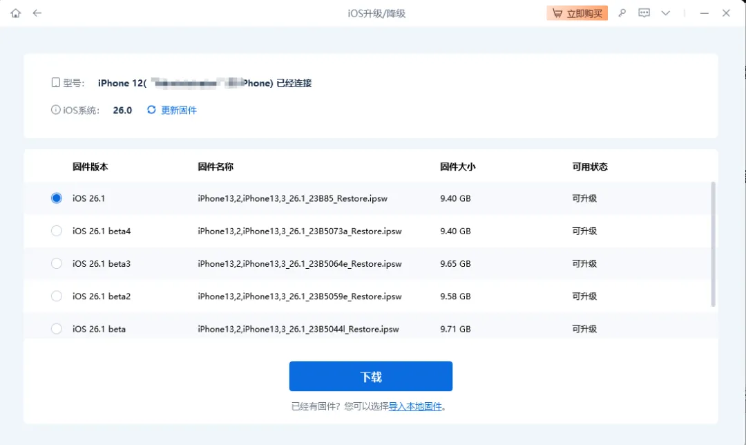 步骤2:选择升级功能,点击【升级】获取可升级iOS固件