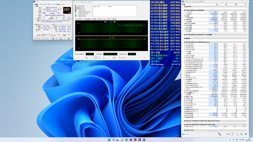 测试环境室温为30.5°C,首先来看看默认设置状态下的R9 9950X3D,此时功耗控制在165W左右。在默频单烤10分钟后CPU表面温度维持在72°C,核心温度维持在83°C,核心频率平均维持在3.91GHz左右。