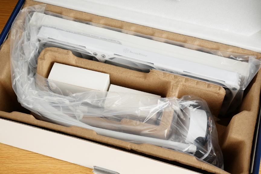 打开包装后即可看到水冷本体放置在环保的瓦楞内衬,出场即预装风扇,方便玩家开箱即用,无需再花费时间去安装风扇。