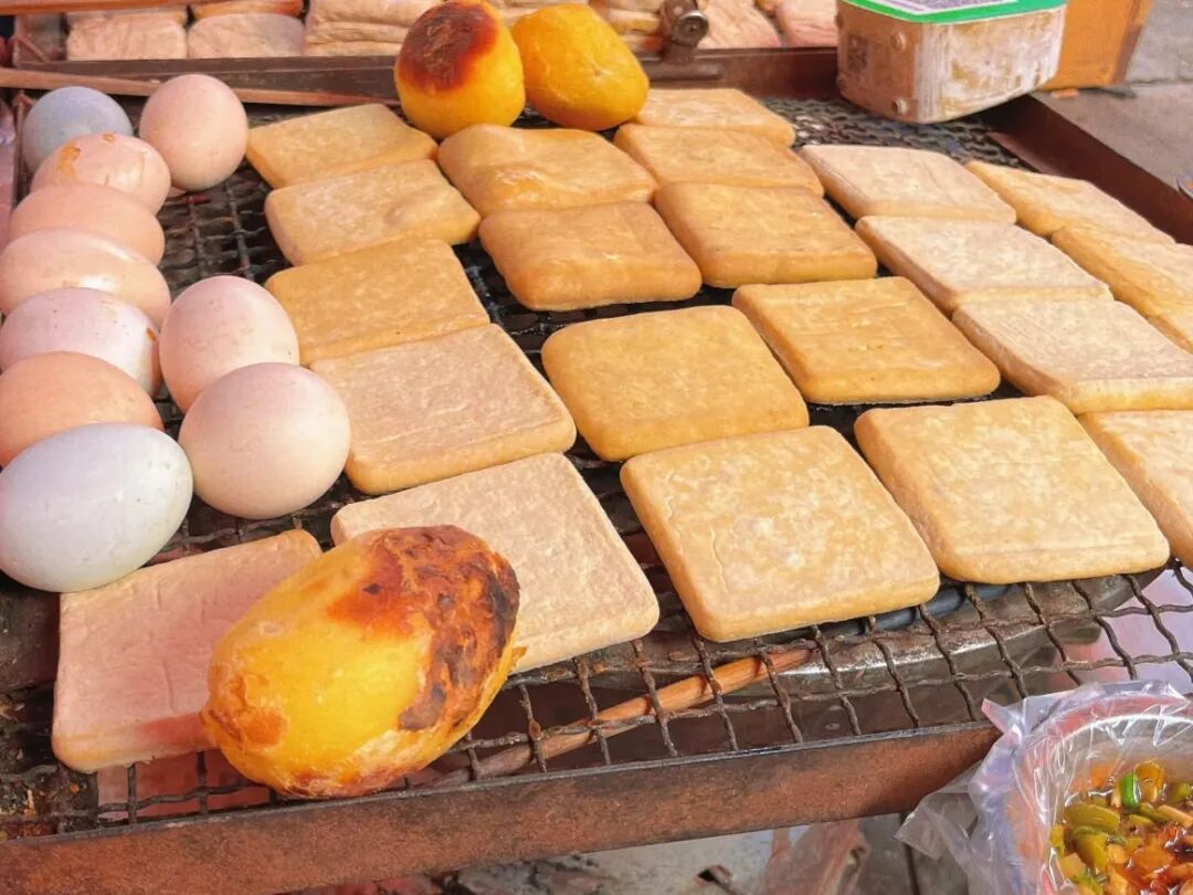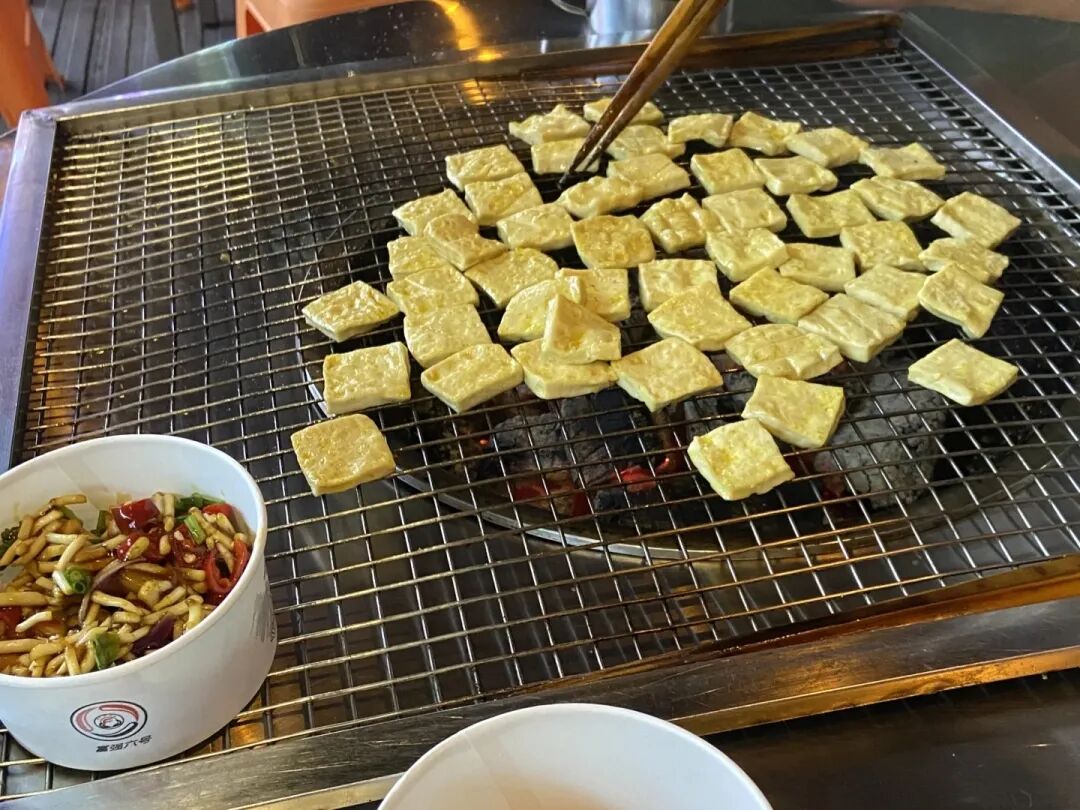 烤网上,一块块被烤的鼓鼓囊囊,饱满可爱的豆腐,别提多诱人了。
