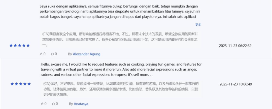在印尼地区谷歌商店应用评论区,很多用户反馈应用具有趣味性,并提出了一些个人建议。其希望开发者能够增加烹饪、模拟旅行等更多生活模块的功能、以及小游戏,让体验更加有趣。另外,用户还希望能够给虚拟角色添加更多面部表情,比如愤怒、悲伤以及其他各种各样的表情,以便更好地表达情感。