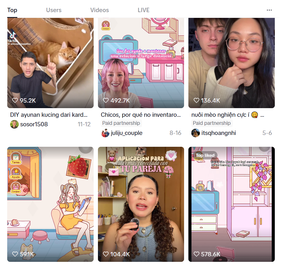 其中,最受欢迎的3条合作视频,点赞量分别是57.8万、49.2万、13.6万,此外还有多条点赞量千级以上的视频,这些付费合作视频都给Couple2带来了有效的流量曝光。值得注意的是,这些合作视频虽然都在主推应用,但是从内容来看,并未凸显同质化问题,对App的宣传特点与每位博主的风格、感情状况、粉丝受众结合得很紧密。