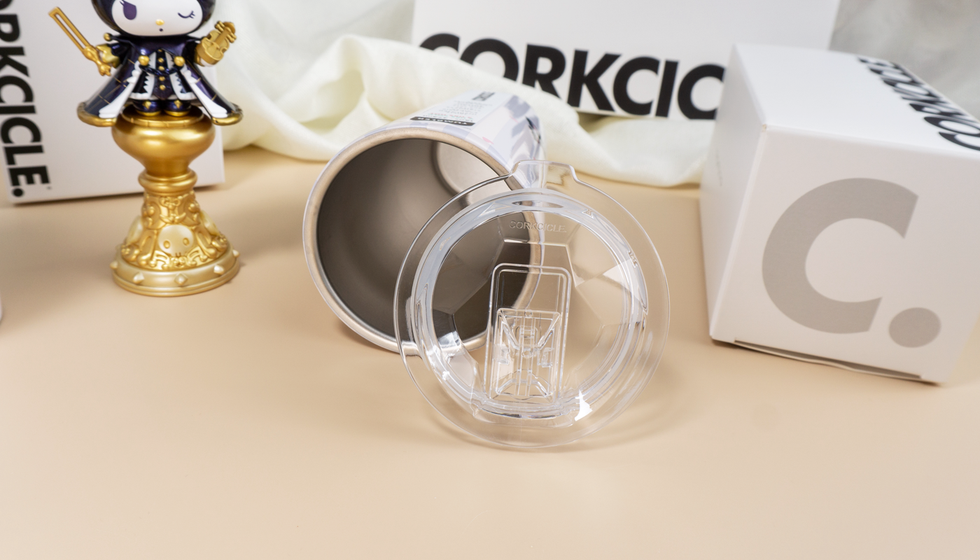 并未采用常规收口,而是在直径达85mm的阔口杯沿之上,“嵌”上了一个食品级的透明Tritan杯盖。该防尘杯盖的特色在于自带一个推滑的小饮口设计,无需取下杯盖即可直接饮用,构成区别于保温杯的核心特征。