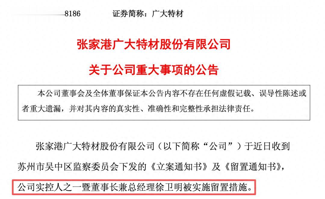 10月14日,广大特材发布公告称,公司于近日收到苏州市吴中区监察委员会下发的《立案通知书》及《留置通知书》,公司实控人之一暨董事长兼总经理徐卫明被实施留置措施。截至目前,公司尚未知悉上述事项的进展和结论。