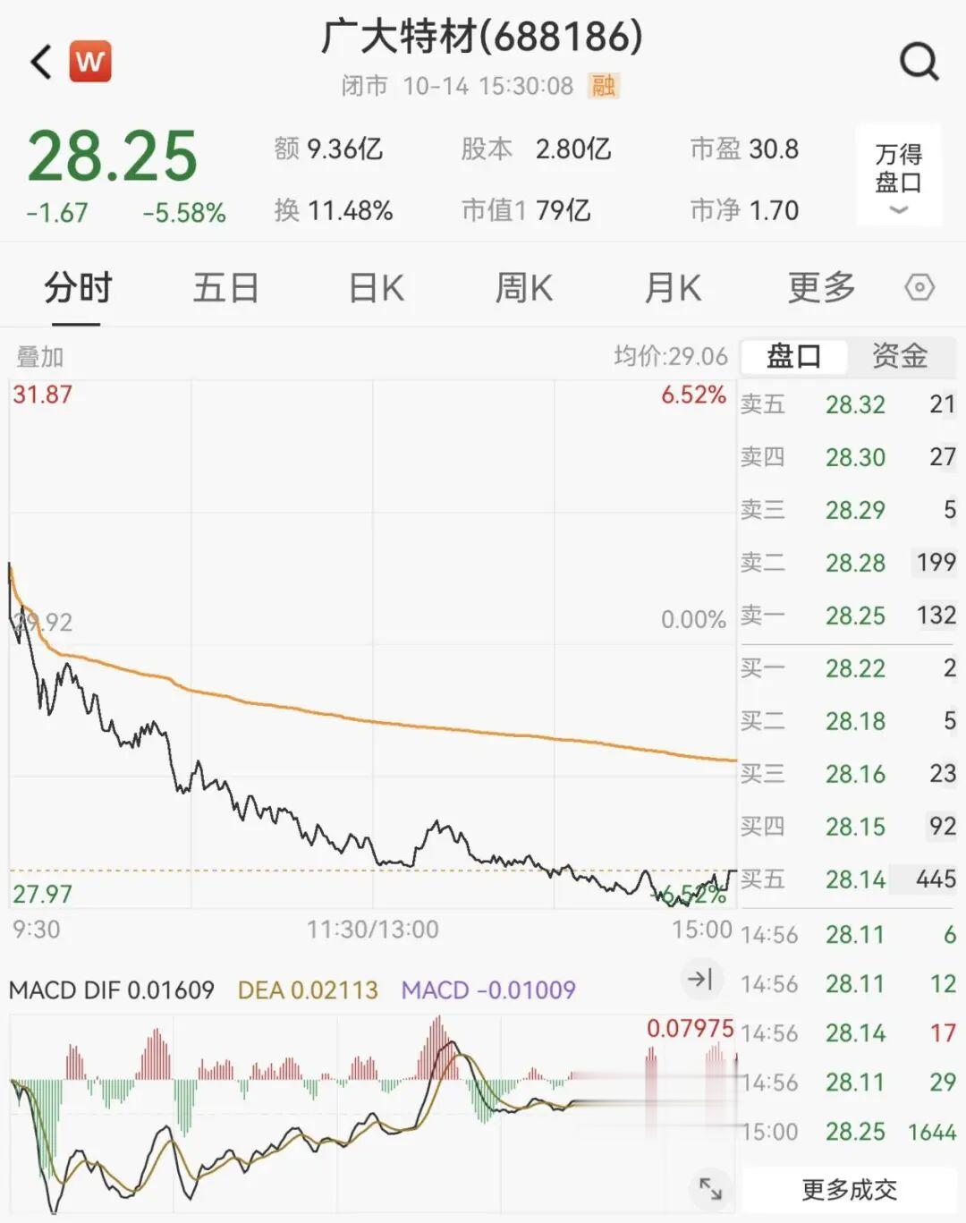 截至10月14日收盘,广大特材股价报28.25元/股,总市值为79亿元。