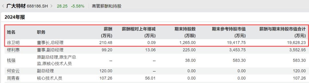 2024年年报显示,徐卫明2024年年薪为210.48万元。截至2025年6月末,徐卫明直接持有广大特材1265万股,持股占比为5.6%。