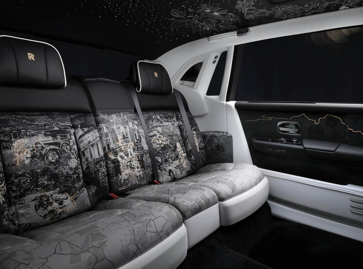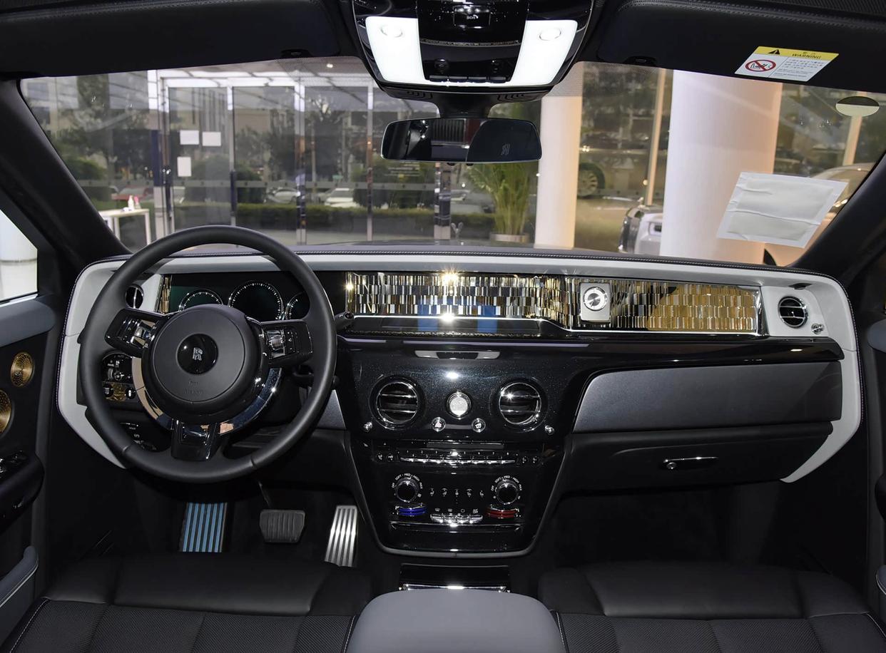 劳斯莱斯幻影“百年华诞”内饰采用大面积诗米安材质、织物与皮革结合的铺陈,也是致敬历史经典车型。星空车顶配备了树叶艺术彩绘,座椅采用手工编织的奥布松挂毯,手工绘制的艺术作品则讲述了历史故事,门板四周还加入了精妙的木工工艺,并刻画了历史上的伟大壮举,每件作品都融合了3D工艺,讲述历史,也营造出立体感和高级质感。配备了12.3英寸全液晶数字仪表盘+中控屏一体化设计,支持语音控制与5G互联功能。后排配备折叠式屏幕,多媒体触控屏幕、车载冰箱、制冷酒柜、车内香氛系统、Bespoke Audio定制音响系统,应有尽有,尽显奢华。