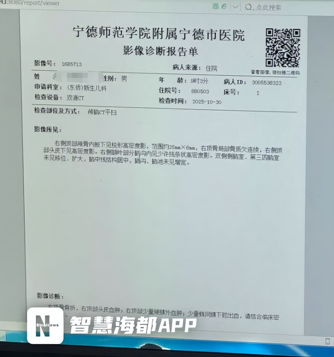 一名刚来到世界仅两小时的婴儿,在医院转运途中,因推车护栏突然打开,重重摔在地上!诊断结果令人揪心——右顶骨骨折、头皮血肿,甚至伴有颅内出血。孩子的父亲林先生在宁德市医院产房门口,亲眼目睹了这惊心一幕。