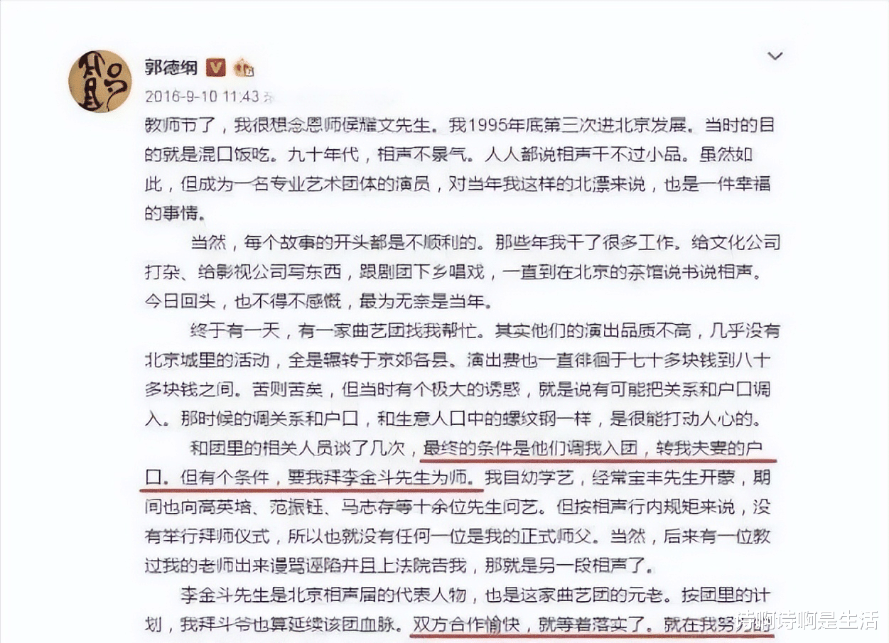 按照李金斗的说法,当时郭德纲拜师并非出于对相声的真挚热爱,而是为了解决自己的户籍问题。