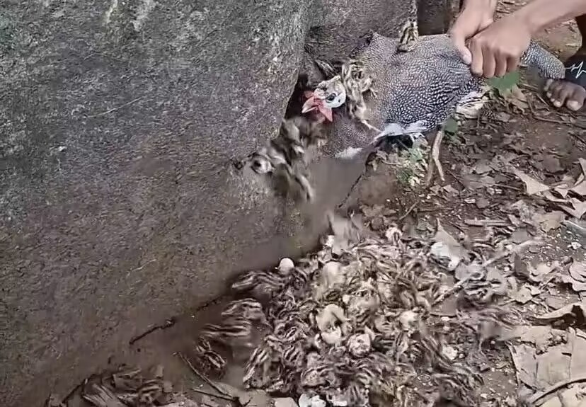这么多的小鸡仔你见过么?它被人从后背拉出出来,一开始没有什么感觉,但是后面发现,这真的是一只珍珠鸡生的幼崽么?有点数不清,有多少只了,而这是刚生完幼崽,还没出洞的珍珠鸡!