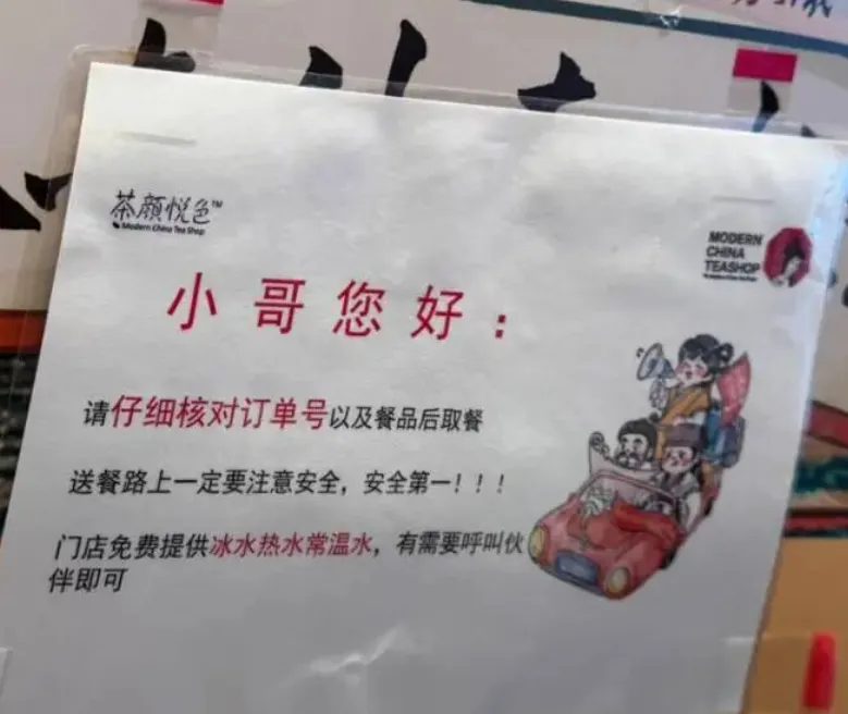 小柴先给大家看看这个牌子长啥样:“小哥您好,请仔细核对订单号以及餐品后取餐,送餐路上一定要注意安全,安全第一,门店免费提供冰水热水常温水,有需要呼叫伙伴即可”