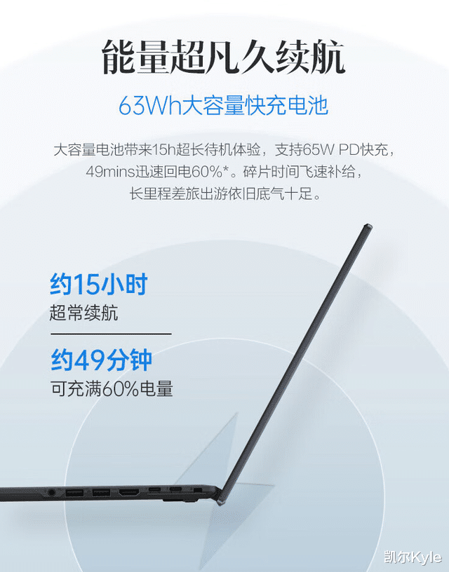 续航方面,华硕破晓Pro搭载了63WH大容量快充电池,支持65W PD快充技术,仅需49分钟即可回电60%,满足你全天候的学习与工作需求。无论是图书馆的深度阅读,还是咖啡馆的灵感碰撞,都能确保电量充足,无需担心电量焦虑。