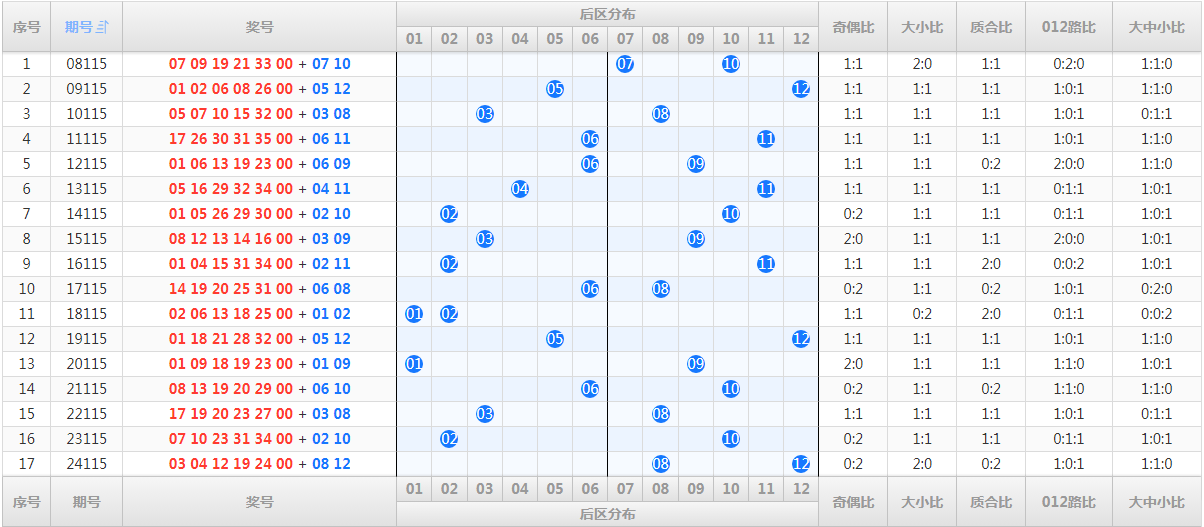 七、历史同期,后区开奖结果和走势图(历史数据演示):