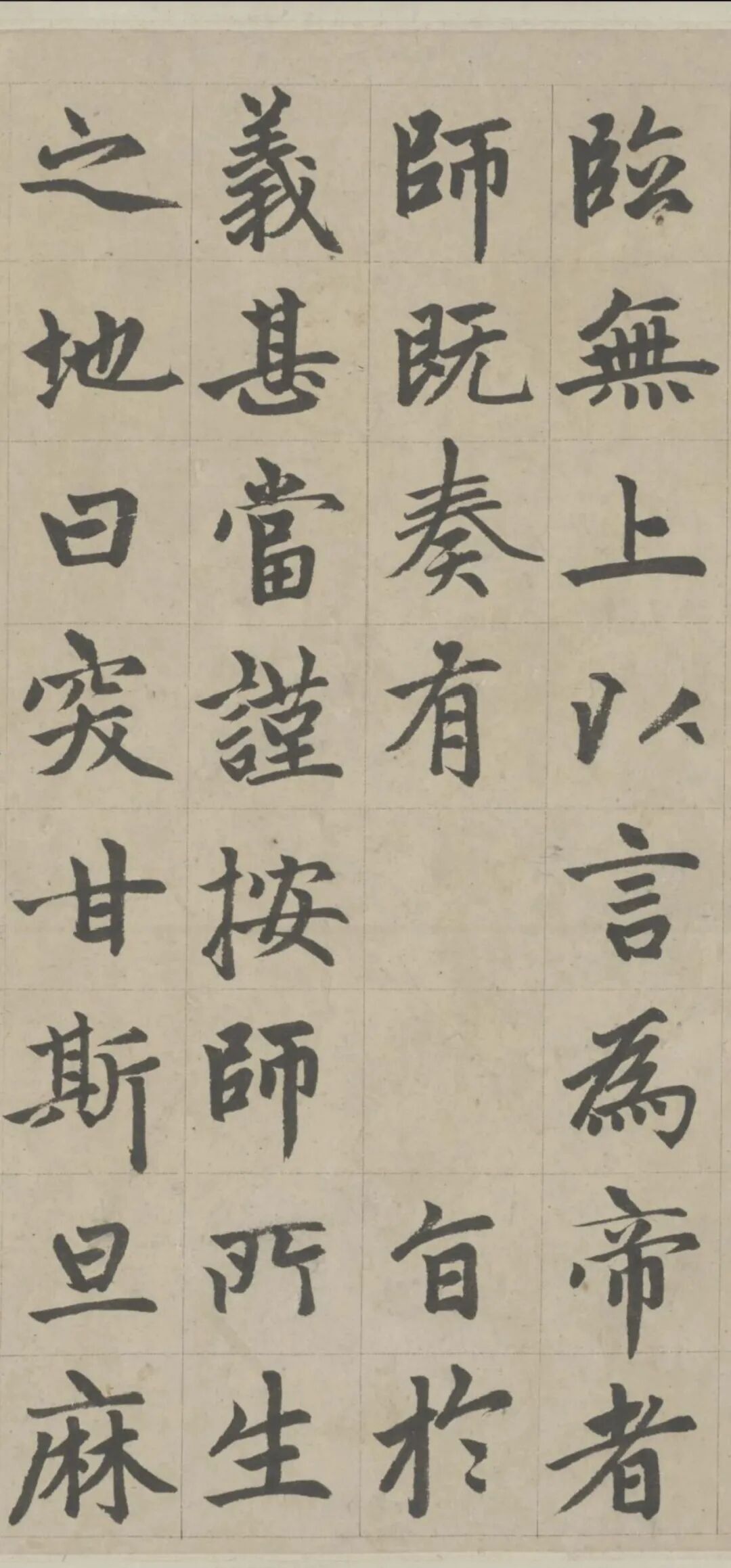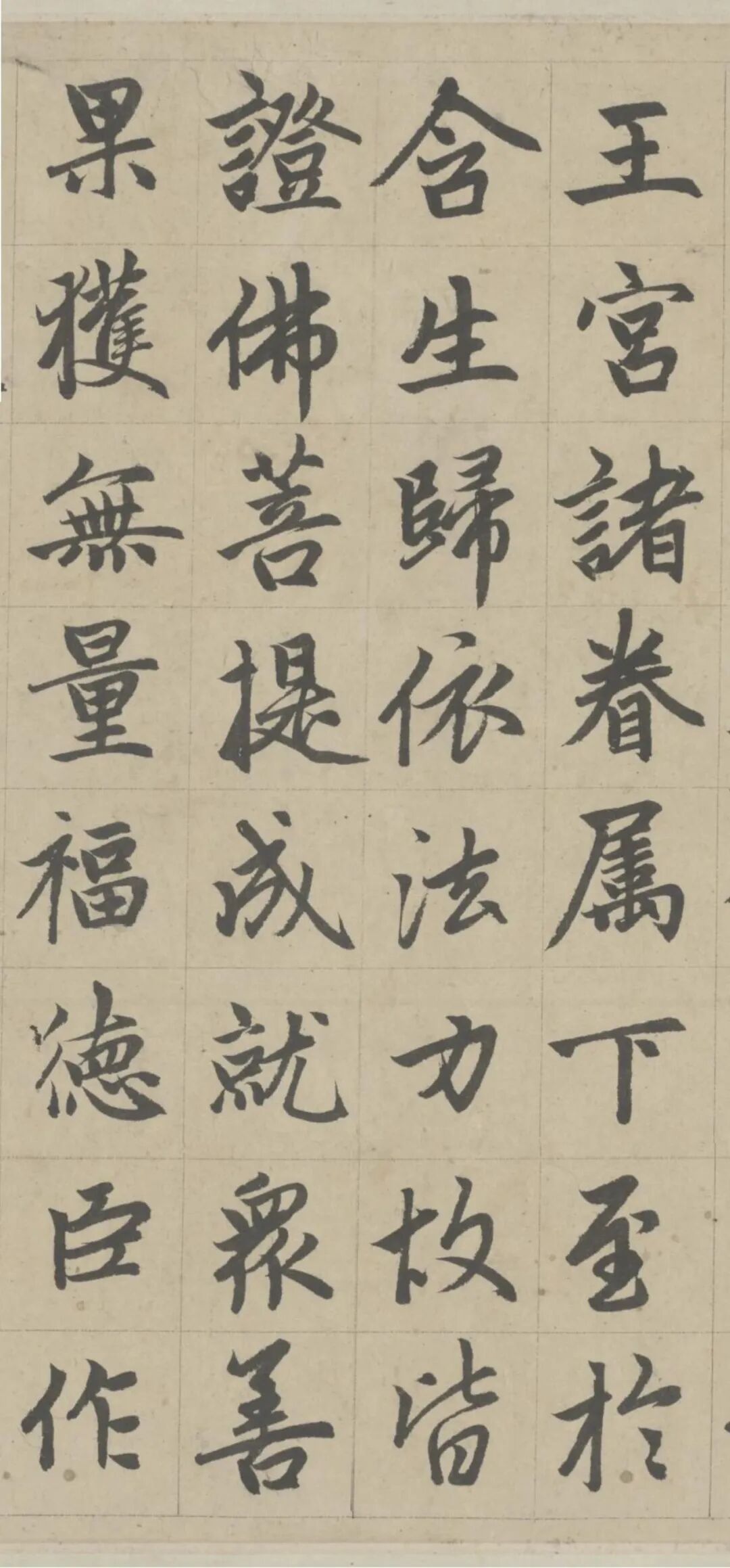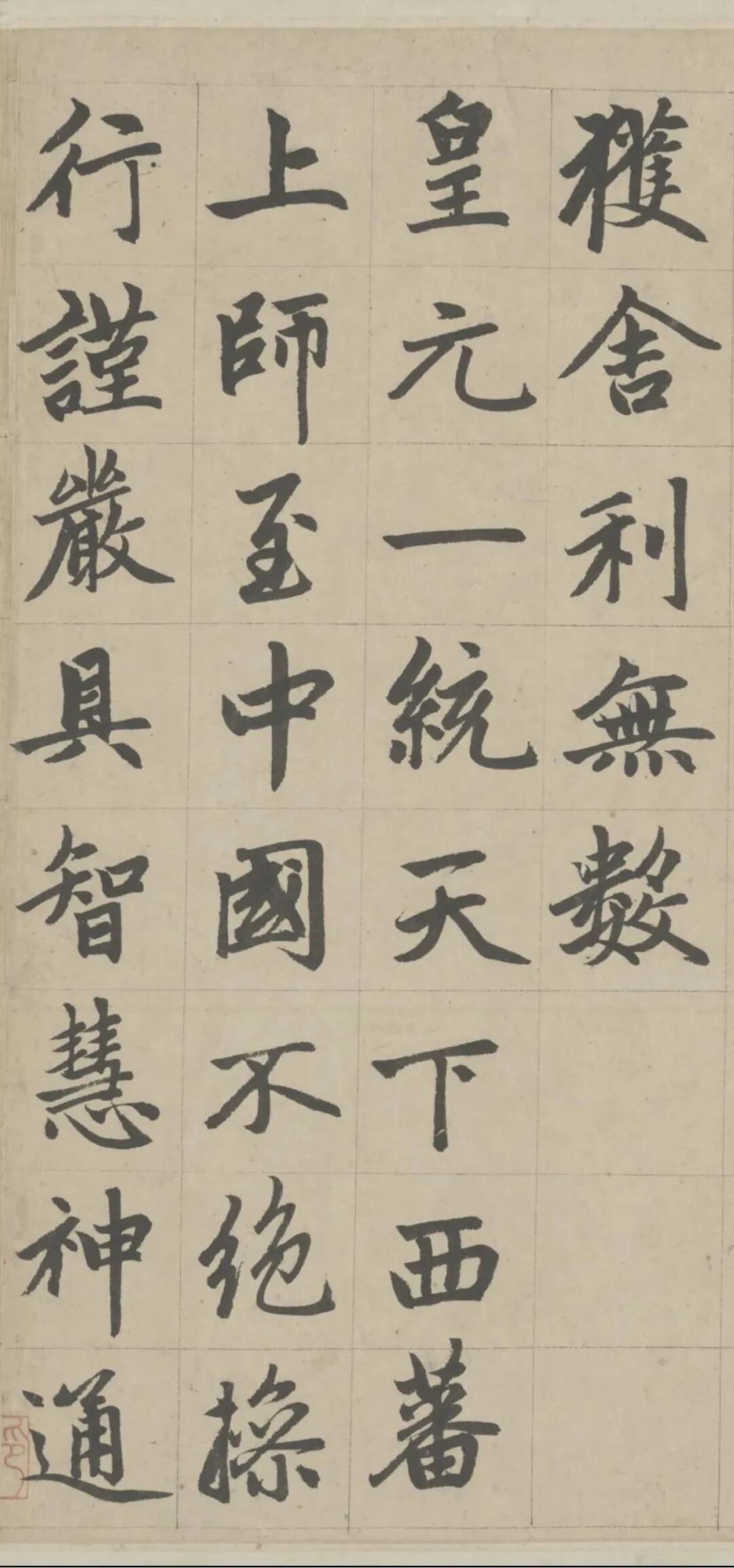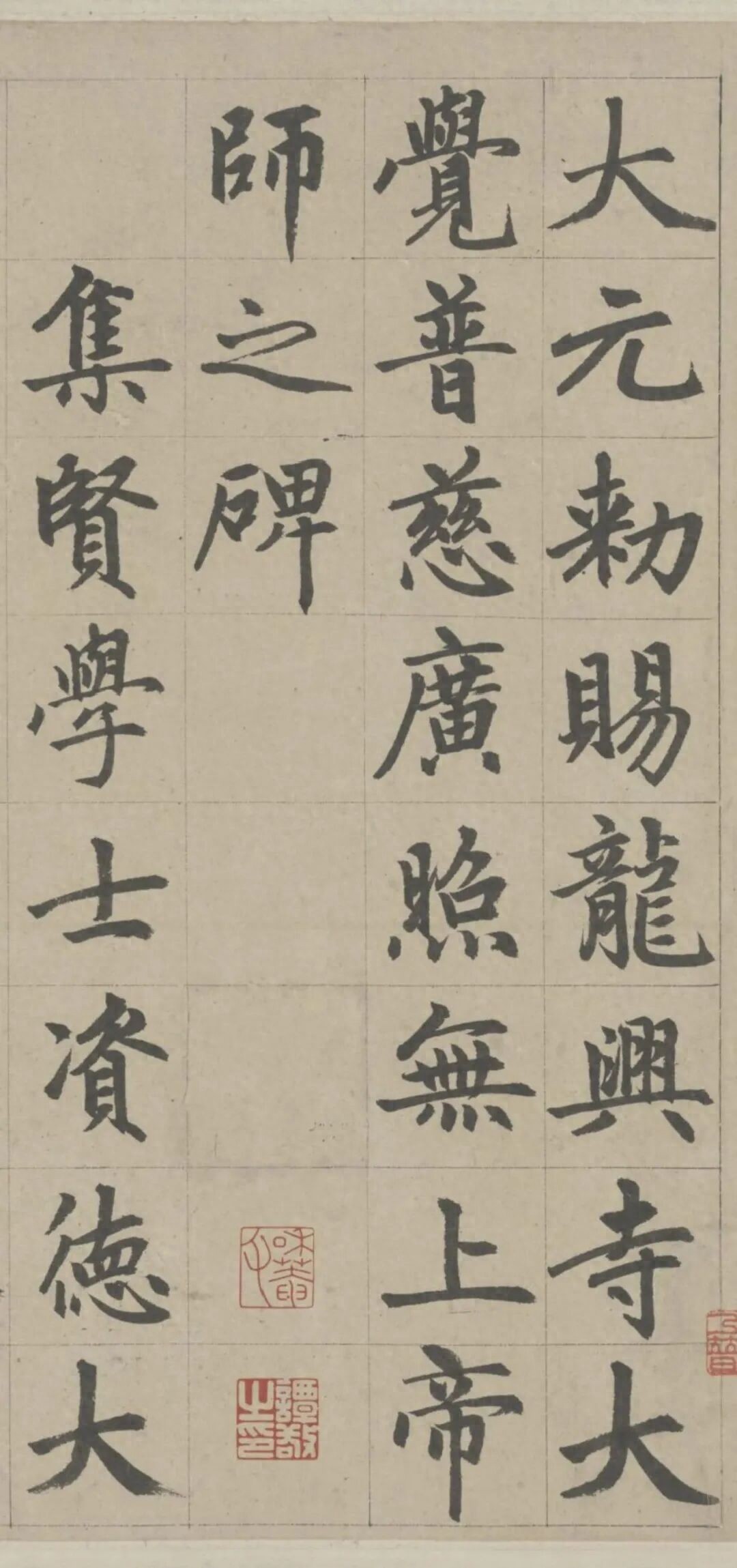 碑文记述藏传佛教帝师胆巴之生平事迹,既是重要之宗教文献,亦是赵氏晚年楷书之代表巨作。此作堪称赵孟頫“赵体”楷书之巅峰典范,其笔法圆融遒媚,中锋运笔沉稳凝练,提按转折婉转流畅,于规整楷法之中融入行书笔意,灵动而不飘浮。结字扁方秀润,中宫收紧、撇捺舒展,疏密得当、端庄宽绰,兼具唐楷之法度与二王之风韵,毫无板滞之气。