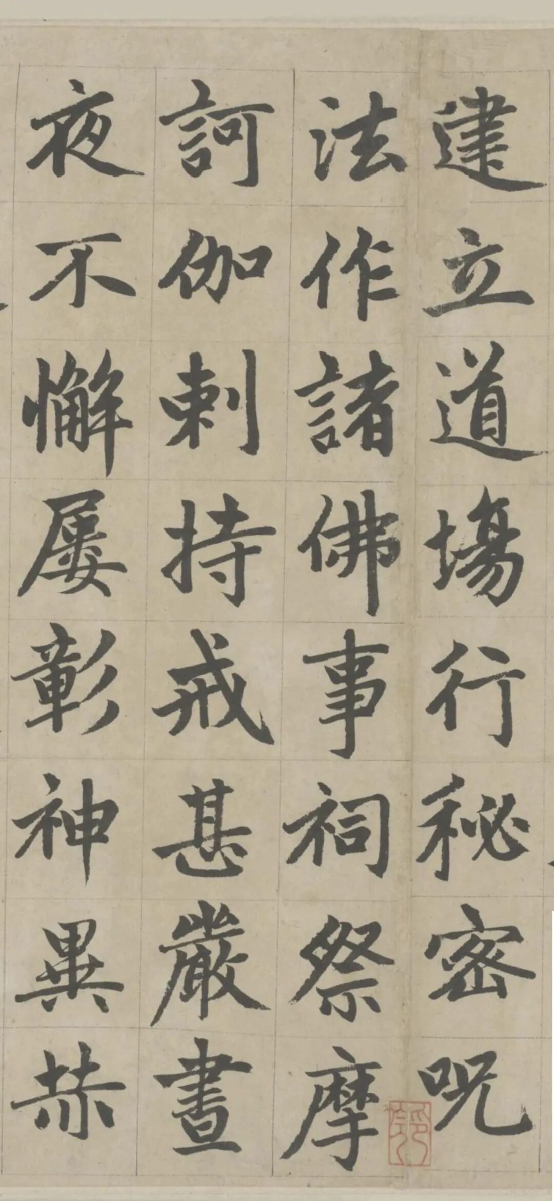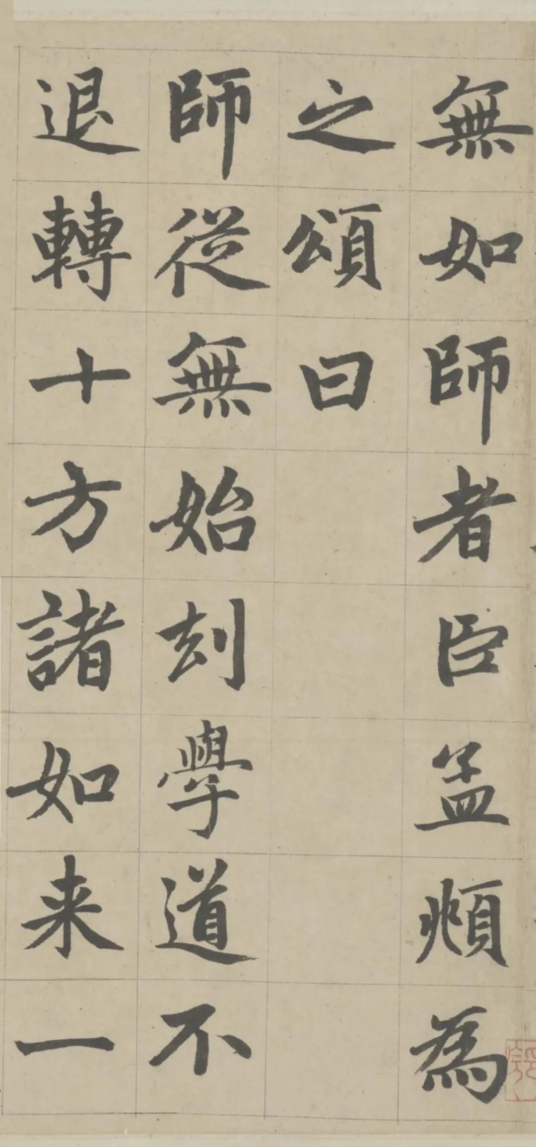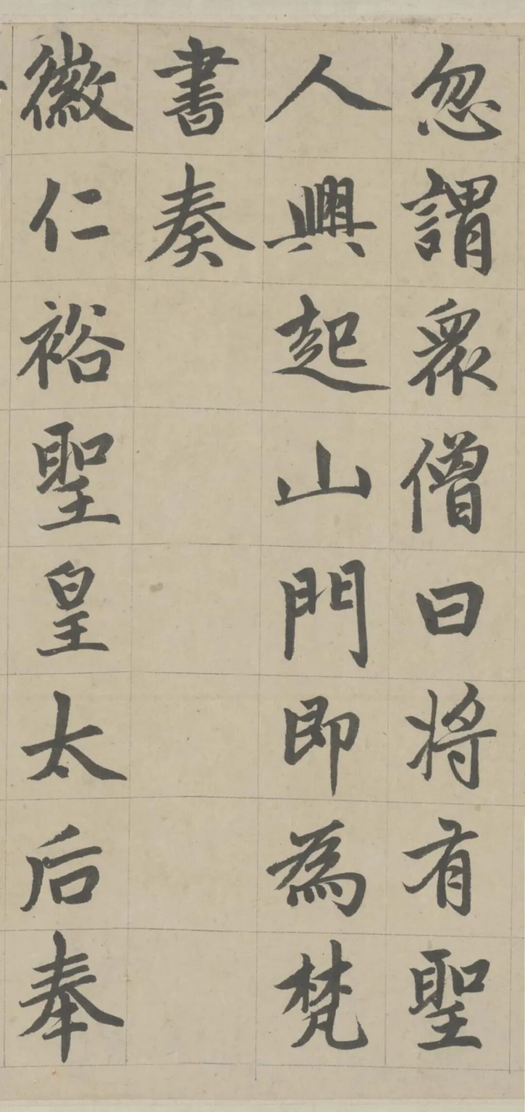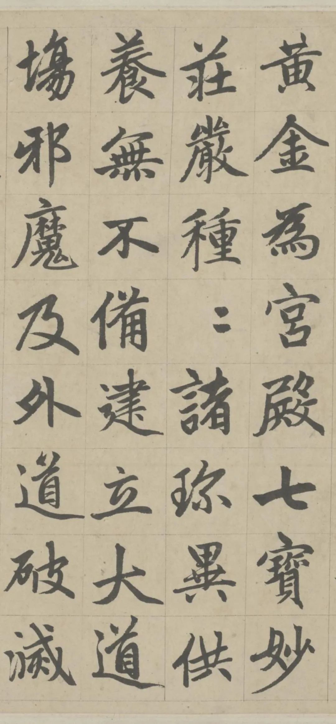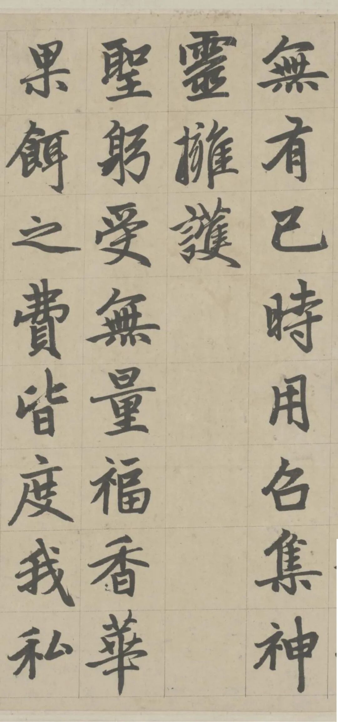 碑文记述藏传佛教帝师胆巴之生平事迹,既是重要之宗教文献,亦是赵氏晚年楷书之代表巨作。此作堪称赵孟頫“赵体”楷书之巅峰典范,其笔法圆融遒媚,中锋运笔沉稳凝练,提按转折婉转流畅,于规整楷法之中融入行书笔意,灵动而不飘浮。结字扁方秀润,中宫收紧、撇捺舒展,疏密得当、端庄宽绰,兼具唐楷之法度与二王之风韵,毫无板滞之气。