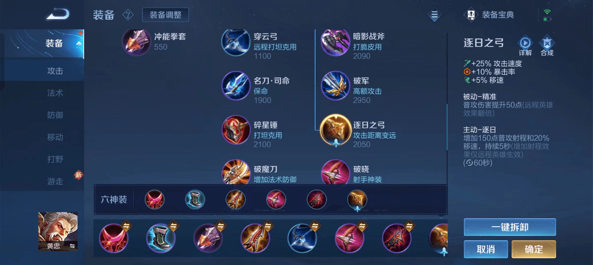 接下来讲讲黄忠在王者峡谷的出装,影刃、抵抗鞋、无尽、破晓、,末世、逐日。做破晓一定要先做穿云弓,不然你会打不动肉。后面看对面回血多不多,不多做饮血剑,多就做制裁肉。坦度高就多做末世。逐日苍穹是可以根据阵容选择的,也可以换其他肉装。