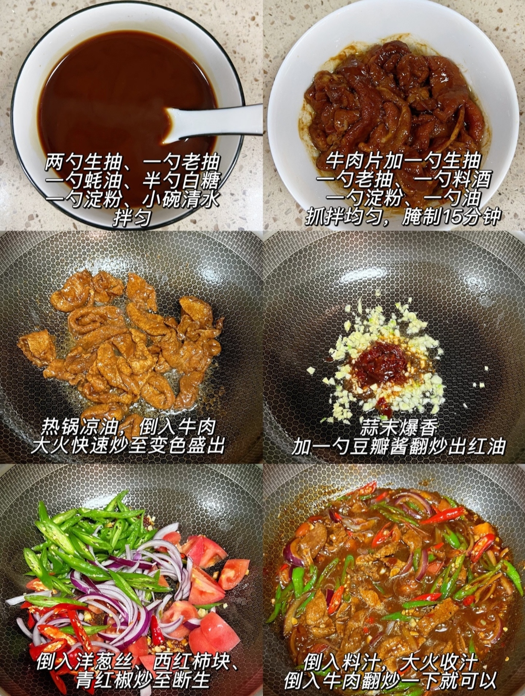 Step 2 滑牛肉:锅烧热到冒轻烟,倒 2 勺油,油纹一出现就下牛肉,大火 20 秒快速划散,肉一变色边缘还带粉立刻盛出——“八分熟”锁汁,回头还要回锅,别怕不熟。