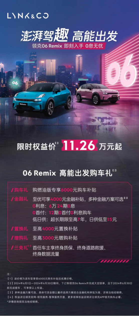 有颜值、有配置、有性能,这样的SUV才是年轻人的出行刚需。更重要的是,该车配置版的售价也仅10万出头,基本能满足大部分年轻人的预算。横向对比就会发现,领克06 Remix的质价比遥遥领先。值得一提的是,目前官方还推出了高能出发购车礼活动,其中包含购燃油版专享6000元购车补贴、至高4000元置换补贴、首任车主享终身质保等多种权益,综合优惠后,领克06 Remix的起售价仅为11.26万,活动时间截至6月30日,有想法的朋友要抓紧时间了。