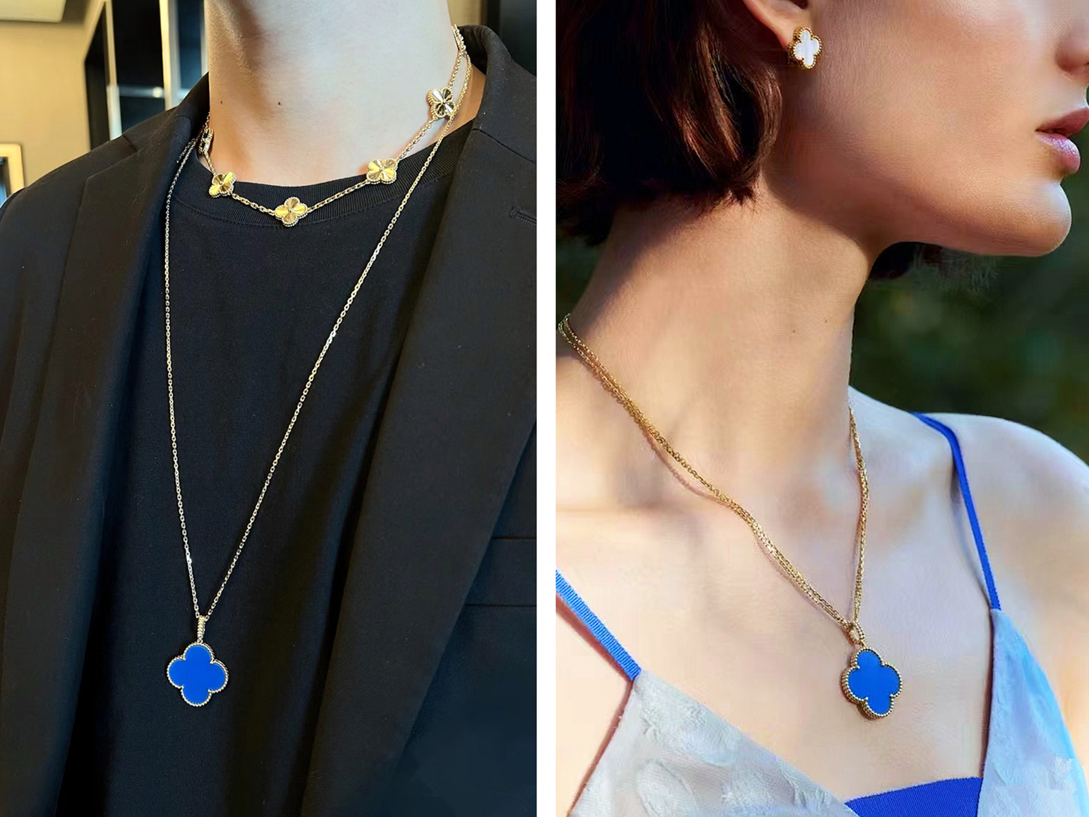 首先映入眼帘的便是那抹金灿灿的圆珠边包裹着蓝晃晃的玛瑙石,这是梵克雅宝家的大号四叶草毛衣链,其外观延续并放大了四叶草家族中最为经典的十字花图案,赋予了珠宝作品更为强烈的既视感和立体感。