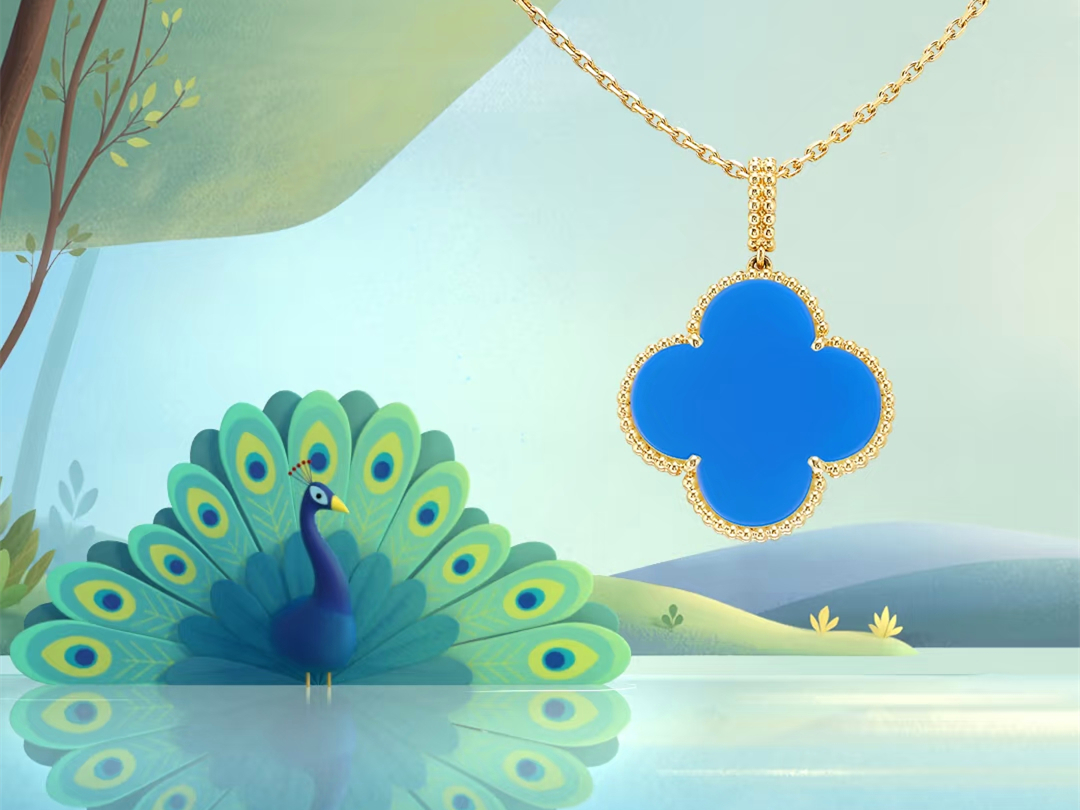 吊坠以柔润的弧度勾勒出四瓣花型轮廓,据说该图案的创作灵感来自于西班牙阿尔罕布拉宫的建筑特点,宫殿内的“桃金娘中庭”和“狮子庭院”等地点均以十字形水渠划分区域,水渠交汇处常设四瓣形喷泉或雕塑基座,形成“四方归心”的宇宙观,梵克雅宝的设计师就是从中提取了“四瓣基因”,让中世纪的摩尔艺术与后现代的珠宝美学,在黄金与宝石的碰撞中,完成了一场跨越千年的艺术对话。