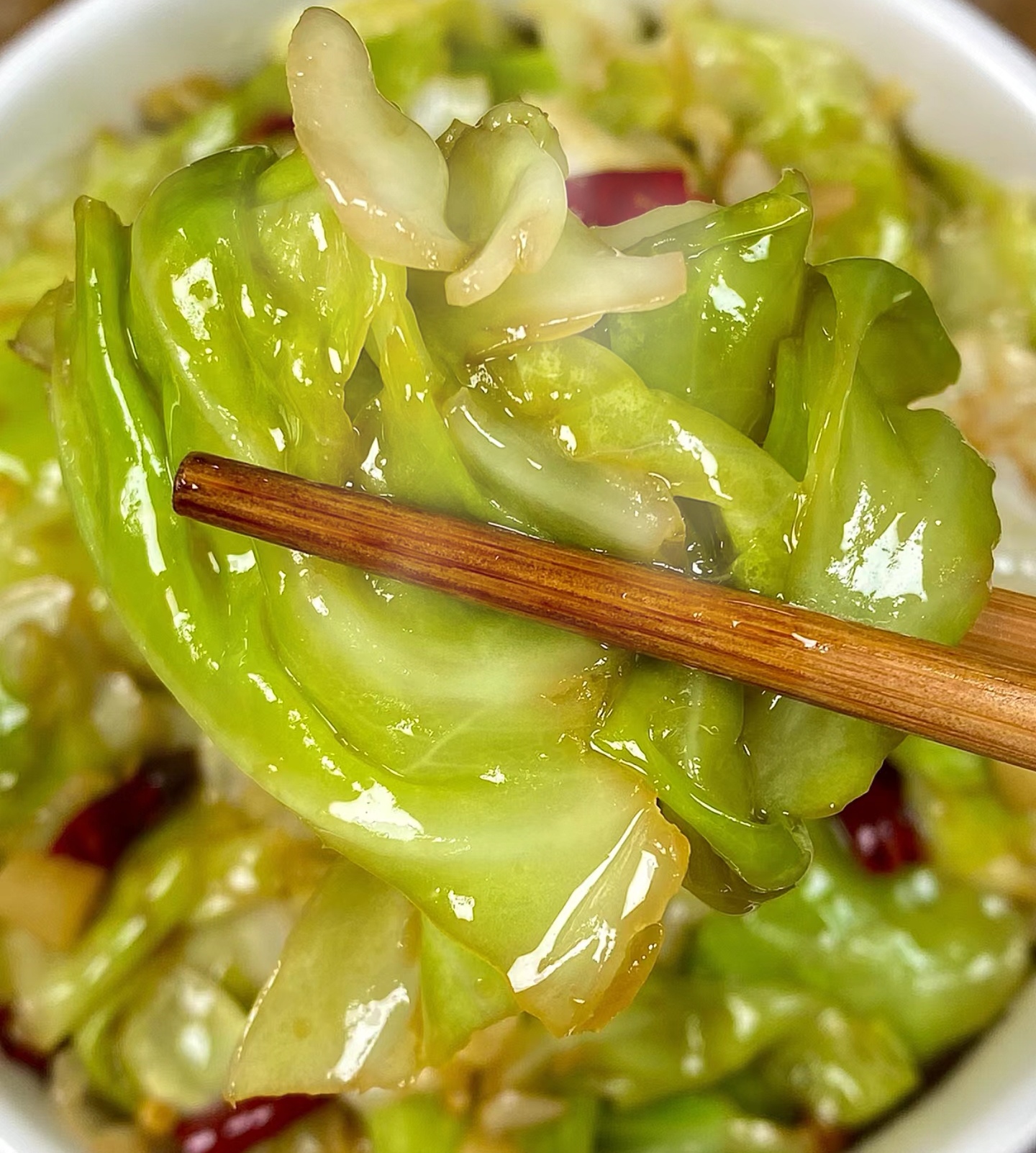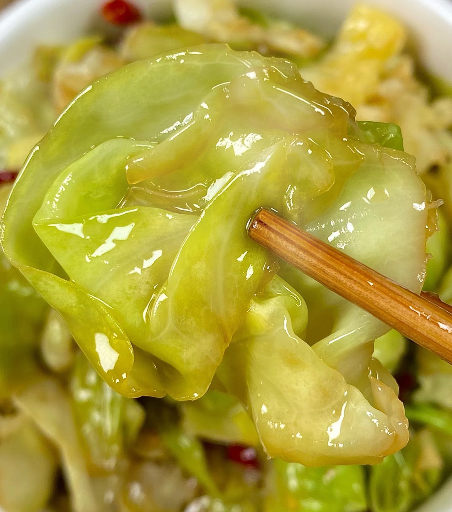 5. 收汁完成: 继续翻炒直至包菜边缘略微发黄,菜叶变得柔软但仍有嚼劲,这时可以尝一下味道,根据个人喜好调整咸淡,也可以加入少许鸡精。