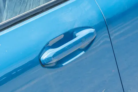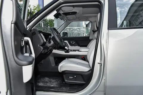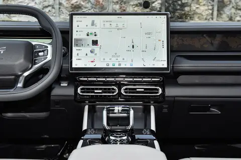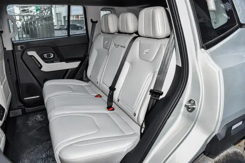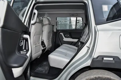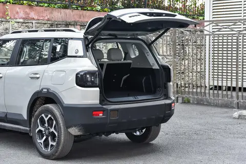 车头的贯穿式地平线灯带是个亮点,点亮时仪式感十足,尤其在夜晚或地下车库,瞬间提升整车颜值。更有意思的是,日间行车灯在解锁车辆时会呈现动态灯语,仿佛车子在向你 “眨眨眼”,这种小细节很容易打动人心。侧面设计简洁实用,悬浮车顶、黑色行李架都是 “真材实料”,家里出门露营时,自行车、帐篷、折叠桌椅都能轻松固定在车顶。加宽的防刮包围和大直径轮毂,在跑烂路时能提供有效保护;传统门把手设计也很贴心,北方冬天戴手套时,比隐藏式门把手方便太多。车尾部分,LOGO 与头灯造型相呼应,辨识度拉满,高位刹车灯搭配大面积尾灯,既实用又带着科技感,处处透着 “不偷懒” 的设计态度。