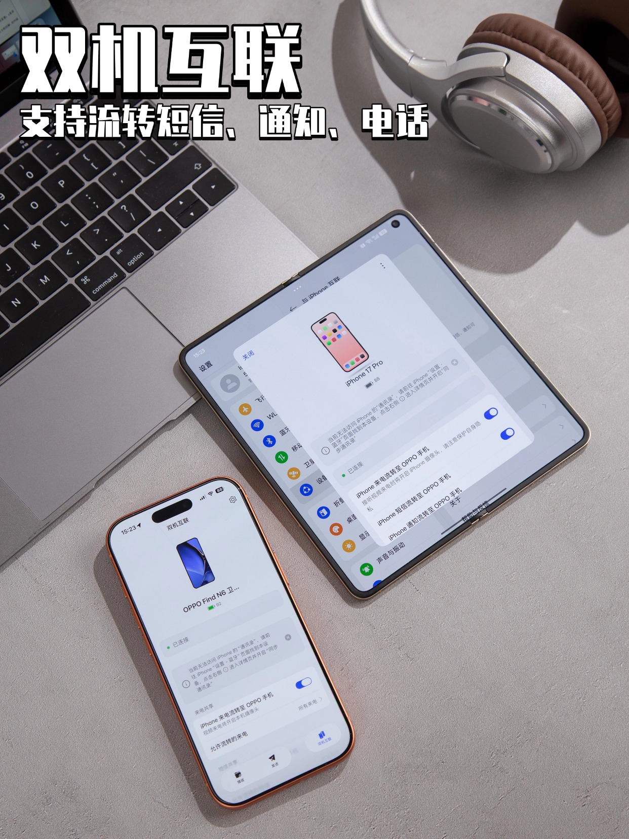 双机互联功能→连接成功后,我iPhone 16 Pro Max上的短信、通知以及电话都能实时流传到OPPO Find N6上,关键信息不用担心错过;OPPO互传→iPhone 16 Pro Max拍的照片、Live图、文件,都能一步互传到OPPO Find N6,且支持双端互传,出游导照片、办公传文件超方便。