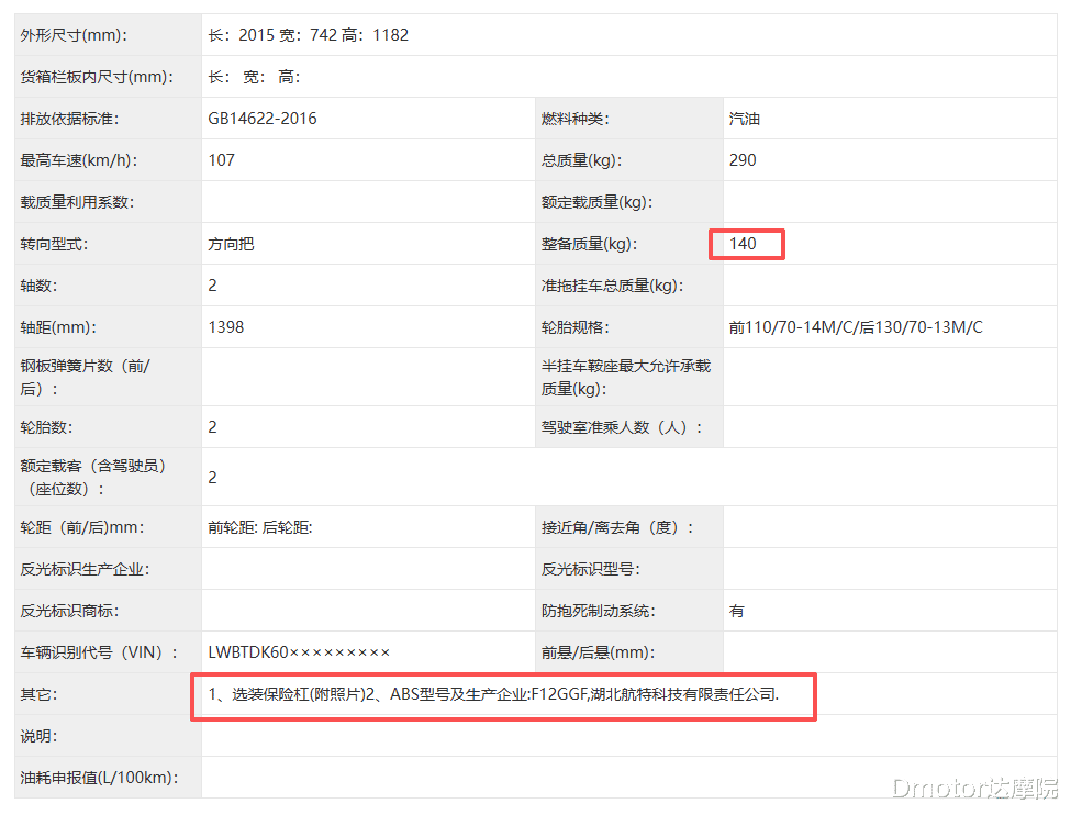 已知配置包括前14后13轮毂、140kg整备质量、航特ABS,高配版本还将配备摄像头系统。