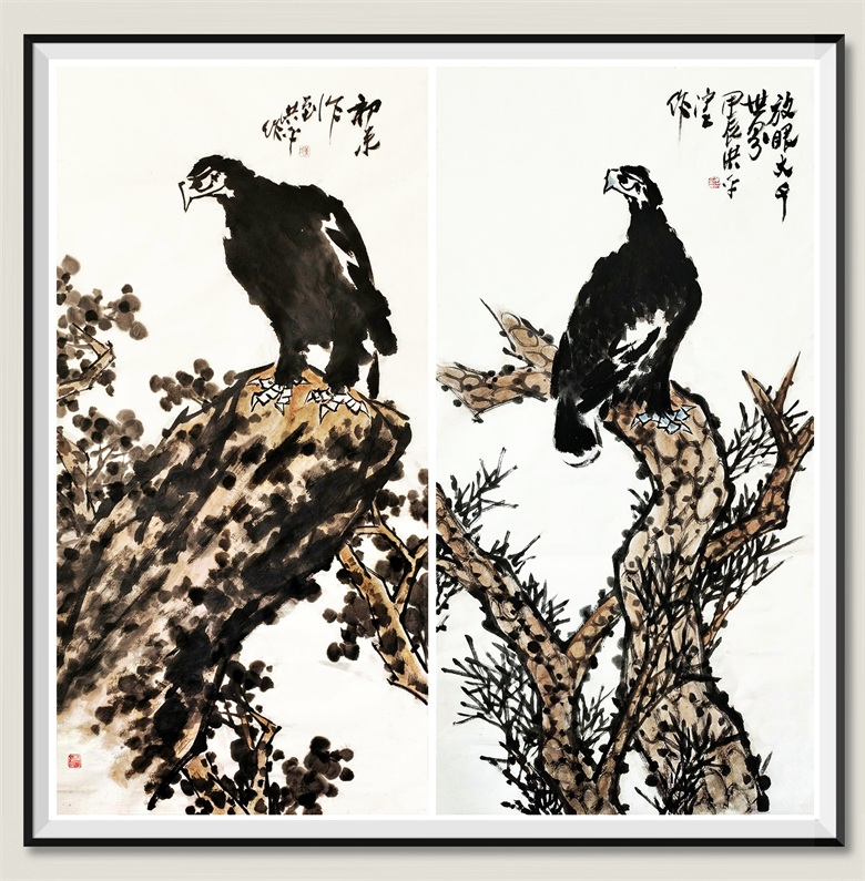 在表现手法上,他常以略带夸张的造型为基础,融入现代构成理念,依矛盾法则统筹画面布局。其中,雄鹰是其代表性题材,作品既吸收历代画鹰名家的艺术精华,又融入个人情感,通过工写结合、收放自如的笔墨,以拟人化手法赋予雄鹰鲜活的艺术生命力。