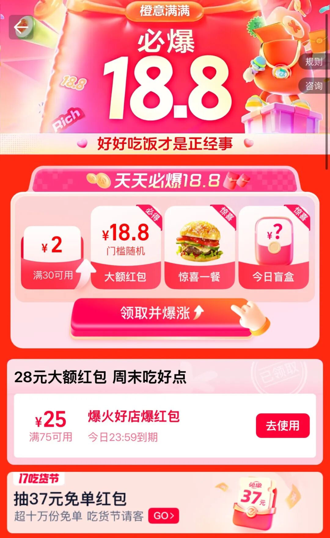 此前一天,饿了么已经在首页上线了多重优惠玩法,核心是给用户发放更多的优惠券;
