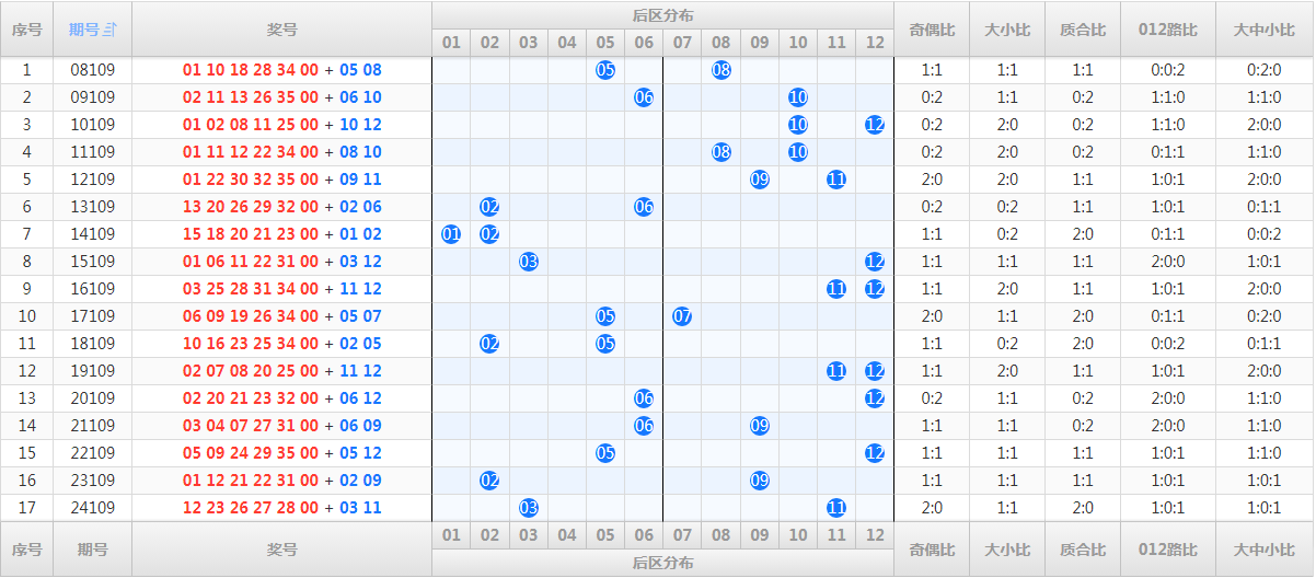 七、历史同期,后区开奖结果和走势图(历史数据演示):