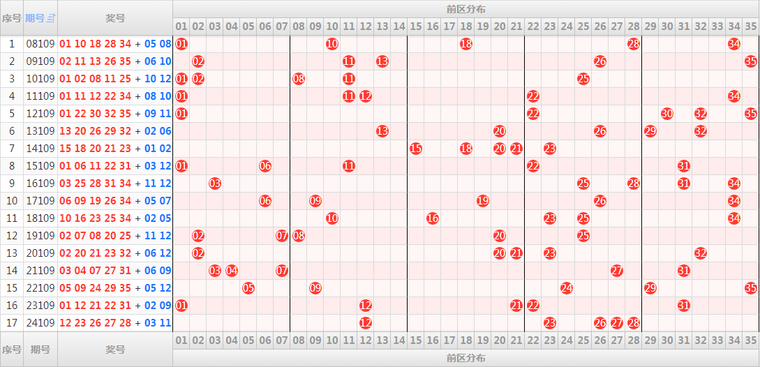 六、历史同期,前区开奖结果和走势图(历史数据演示):