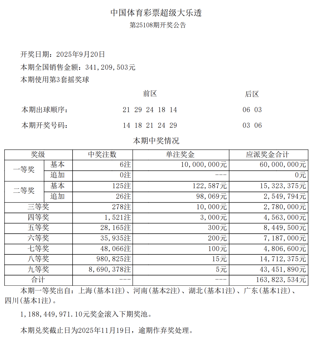 一、上期大乐透第108期开奖结果(历史数据演示):