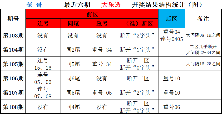 开奖号码结构:前区没有连号,一对同尾14、24,没有重号,断开一区。后区重号06。