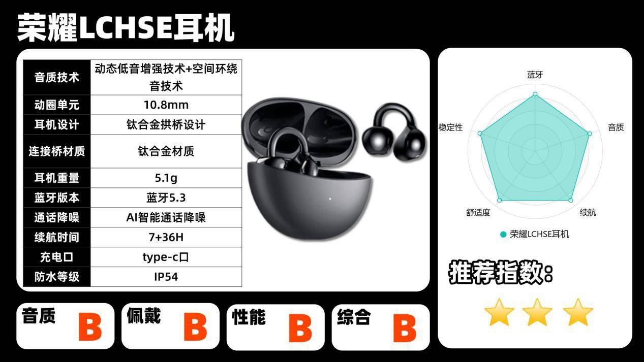 荣耀LCH SE耳机在佩戴上采用了钛合金拱桥结构,耳机的佩戴可以自然的贴合耳型,比较服帖,单只耳机的重量仅5.1克,佩戴时几乎无感。跑步或通勤使用都很稳固,不易掉落。
