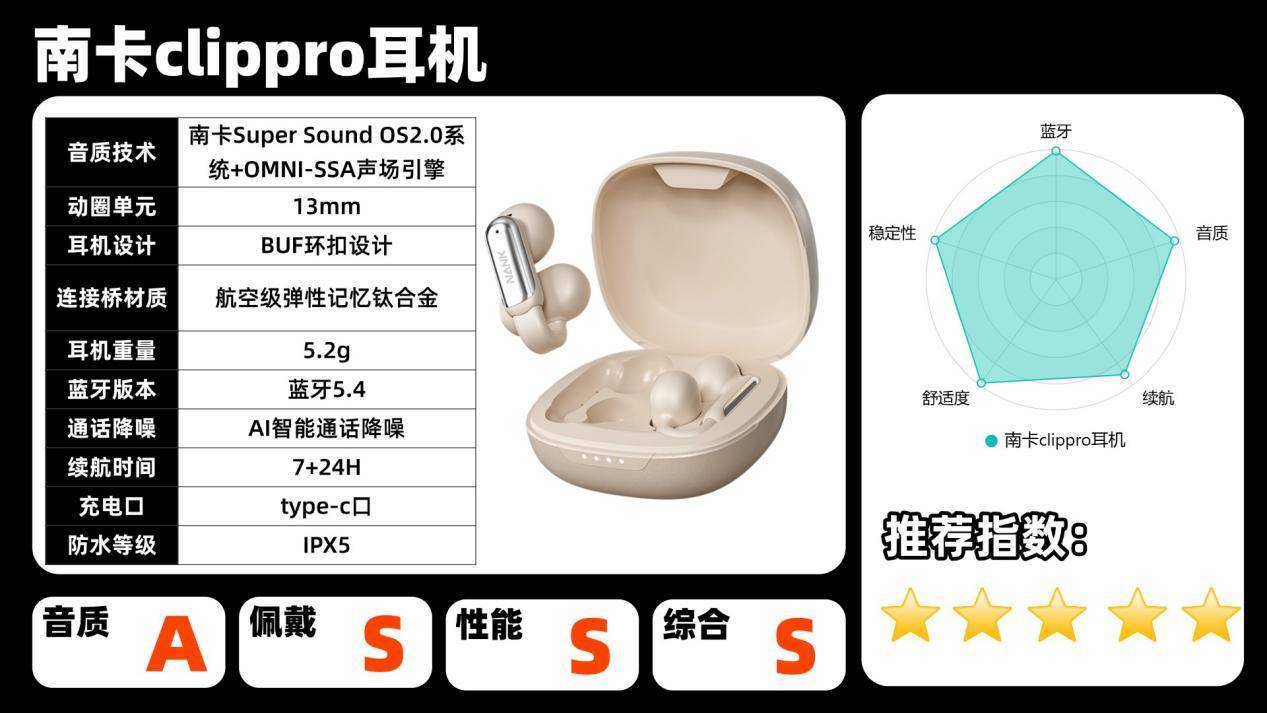这款南卡clippro在佩戴上可谓下足了功夫,采用了BUF环扣2.0和C-Hook 2.0双结构设计,耳机能稳稳地贴合耳廓,既不夹耳又不松动。单只耳机仅5.1克,几乎可以做到无感佩戴,搭配有亲肤的硅胶材质,即使跑步、跳绳或健身也不会滑落,舒适度非常高。