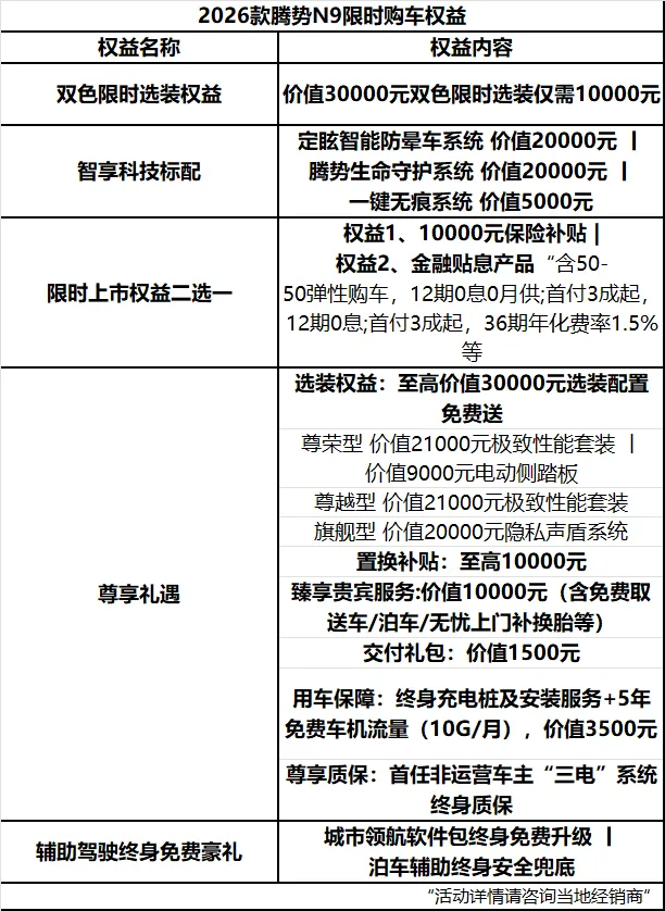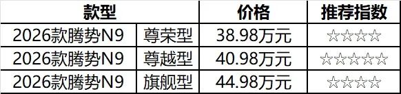 根据腾势N9的三种不同版本的配置和定位的差异,分别对应了三个售价,我们就来拆解一下这三种版本的核心的差异与其所带来的的实用价值