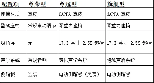 性价比之选尊越型:比尊荣型多花 2 万,换来零重力座椅、吸顶屏等实用配置,厂家还送价值 2.1 万选装包,最值得入手。