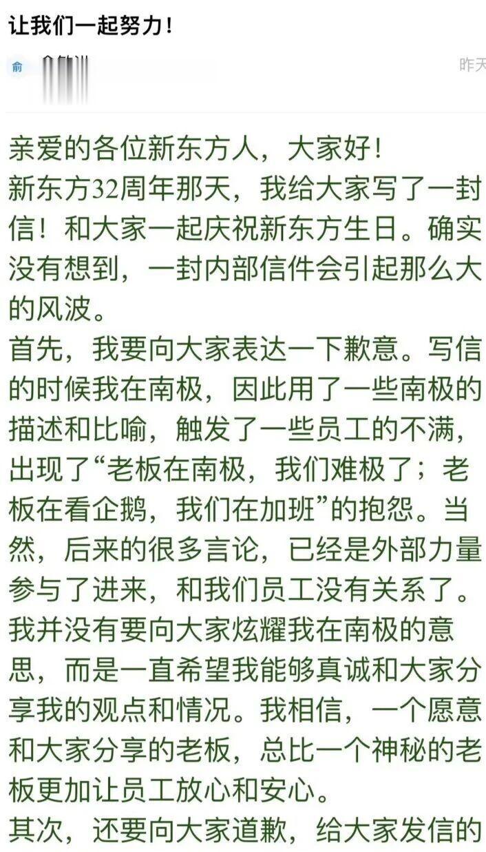 今天俞敏洪发长文道歉了,但是很多网友还是没有放过他,仍在社交平台对他进行道德绑架,认为他不应该去南极旅游并发文刺激加班的员工,这样做很不不能跟加班的年轻人共情;不少自媒体也在带节奏,不知道是不是为了流量,不过也有人觉得没必要说三道四,因为这是俞敏洪的合法收入天经地义。