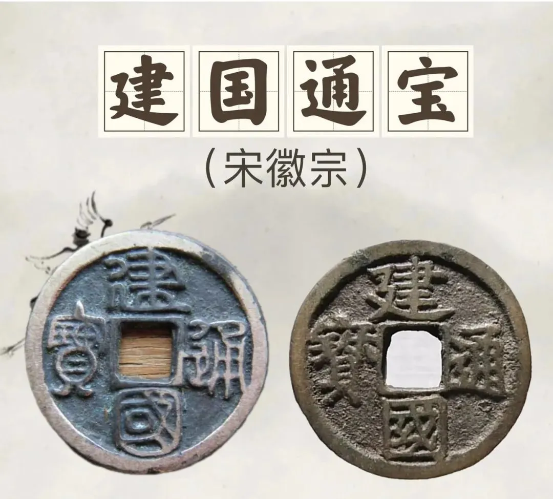 建国通宝是取宋徽宗赵佶“建中靖国”年号首尾二字组合而成铸造的年号钱。据说出土于苏北,曾被钱币收藏大家罗伯昭先生以400银元购得。也有人认为此钱太过离奇,怀疑是建炎通宝改刻而成。但据考证,建国通宝是取建中靖国年号的首尾二字组合而成铸造的货币,却因赵佶的建中靖国年号中的“建中”二字与唐代某年号重复,所以此币刚刚铸成就马上废止,期间还铸有篆书体“靖国通宝”与楷书体“靖国元宝”小平钱,而后改铸非年号的“圣宋通宝”、“圣宋元宝”。因此建国通宝极为珍稀,存世量不超过10枚,无法估价,称建国通宝为北宋第一珍稀币并不为过。