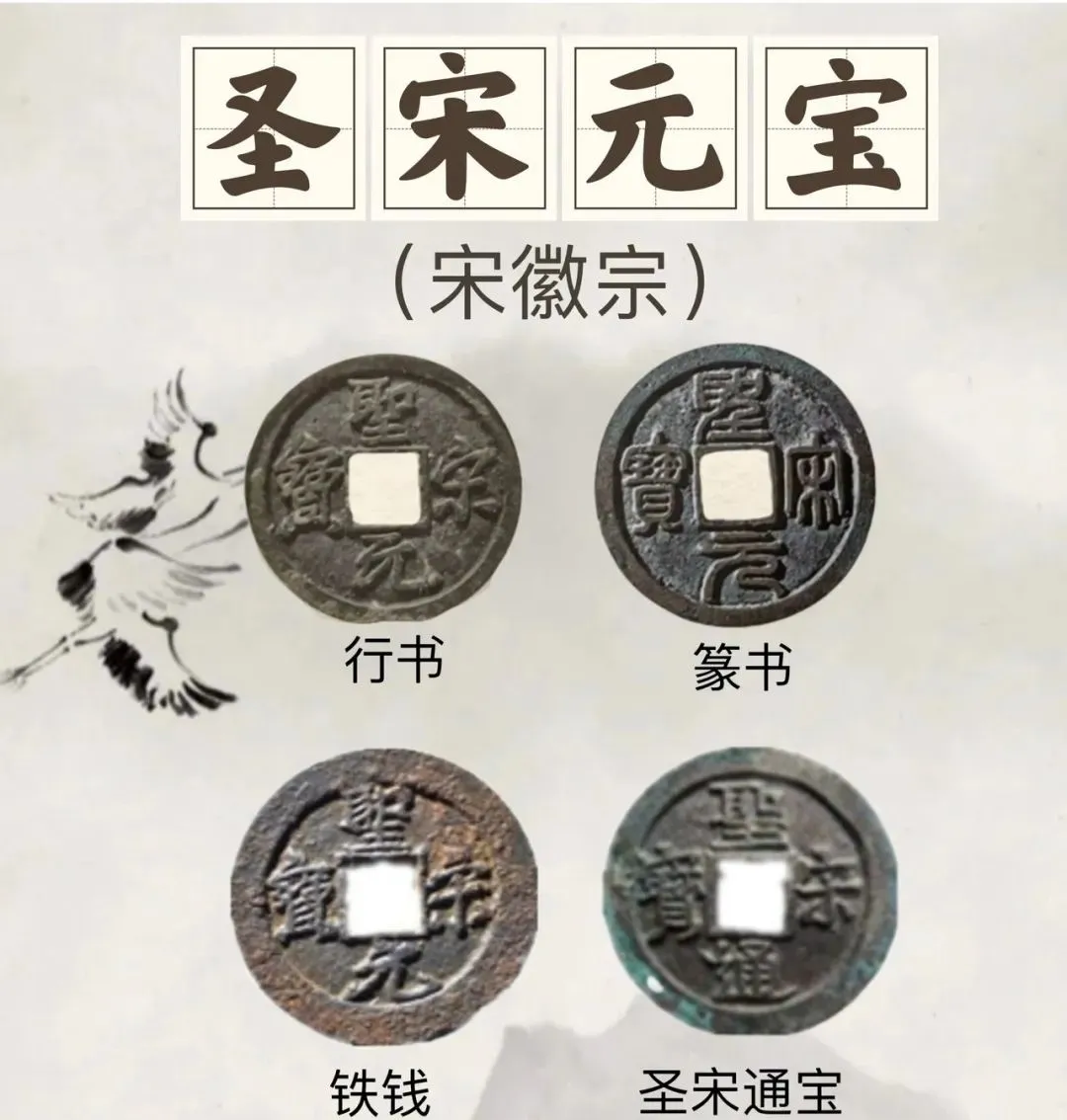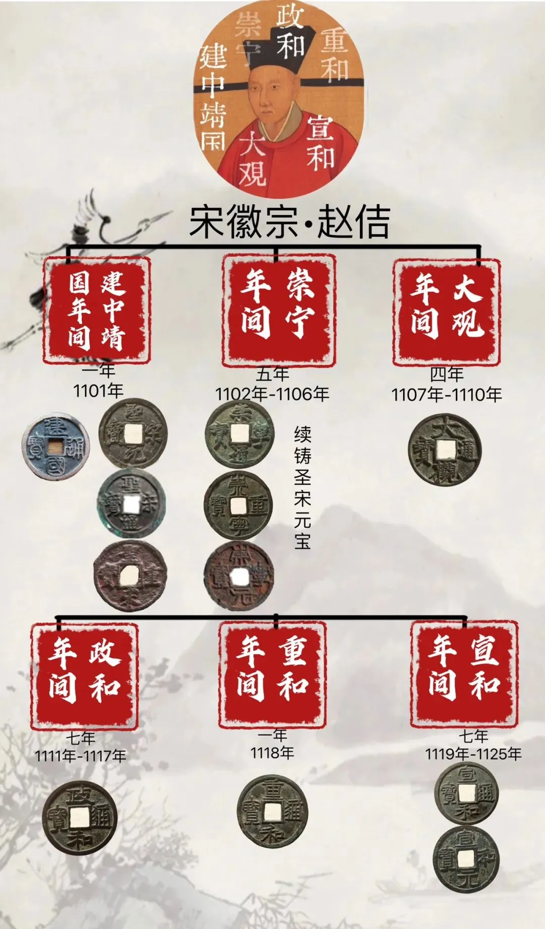 徽宗赵佶,哲宗之子,在位二十五年,改元六次,依次为建中靖国(一年)、崇宁(五年)、大观(四年)、政和(七年)、重和(一年)、宣和(七年)。建中靖国年间(1101年)铸建国通宝,靖国元宝,圣宋元宝,圣宋通宝。崇宁年间(1102~1106年)铸崇宁通宝,崇宁重宝。并续铸圣宋元宝。大观年间(1107-1110年)铸大观通宝。政和年间(1111~1117年)铸政和通宝,政和重宝。重和年间(1118年)铸重和通宝。宣和年间(1119~1125年)铸宣和元宝,宣和通宝。