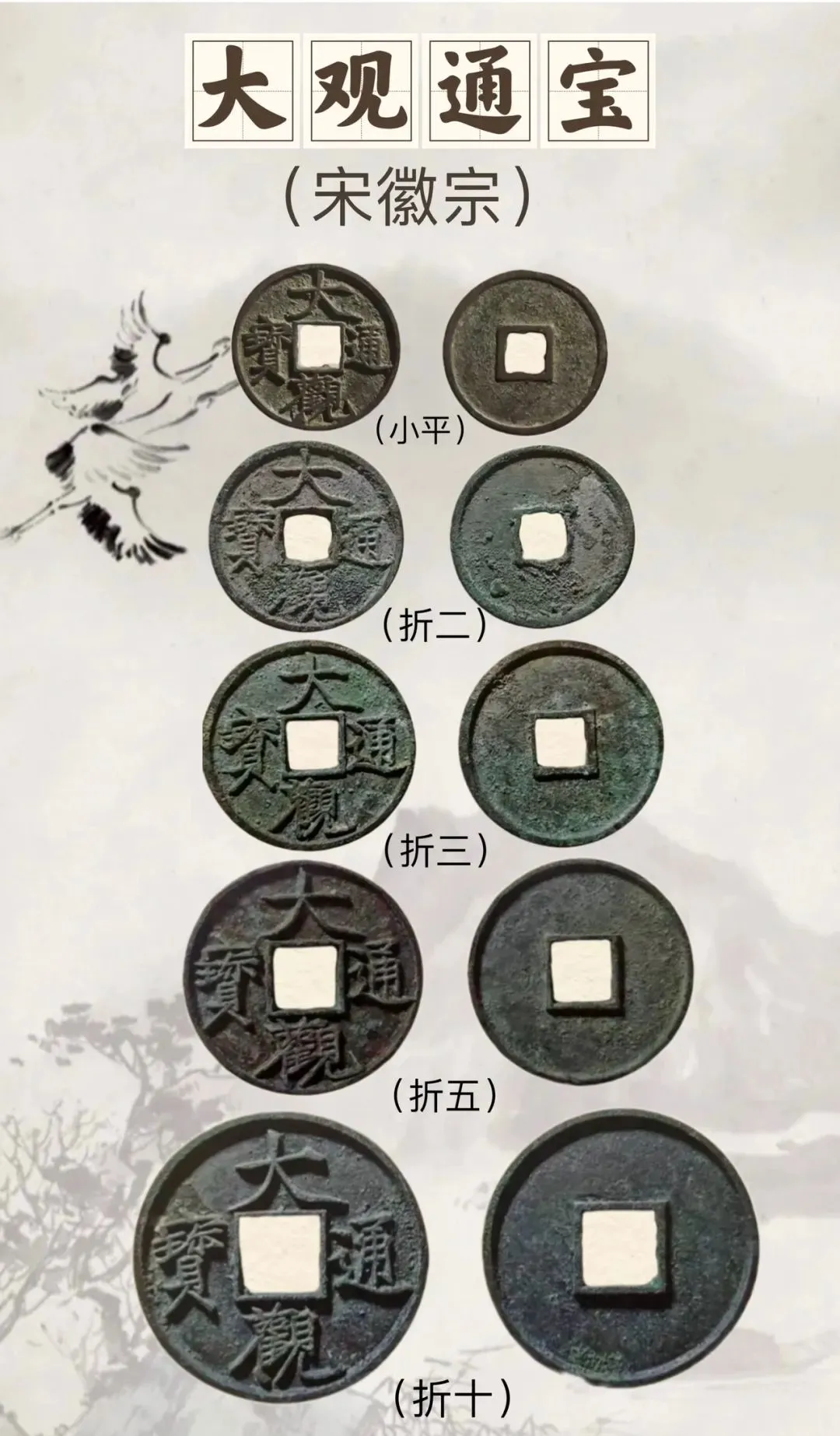 风流天子书大观 铁划银勾字字端大观通宝,宋徽宗赵佶在大观年间(1107年-1110年)所铸造的年号钱。钱文“瘦金体”,有小平、折二、折三、折五、折十等铜铁钱,版别多种。另有行书小平铁钱。