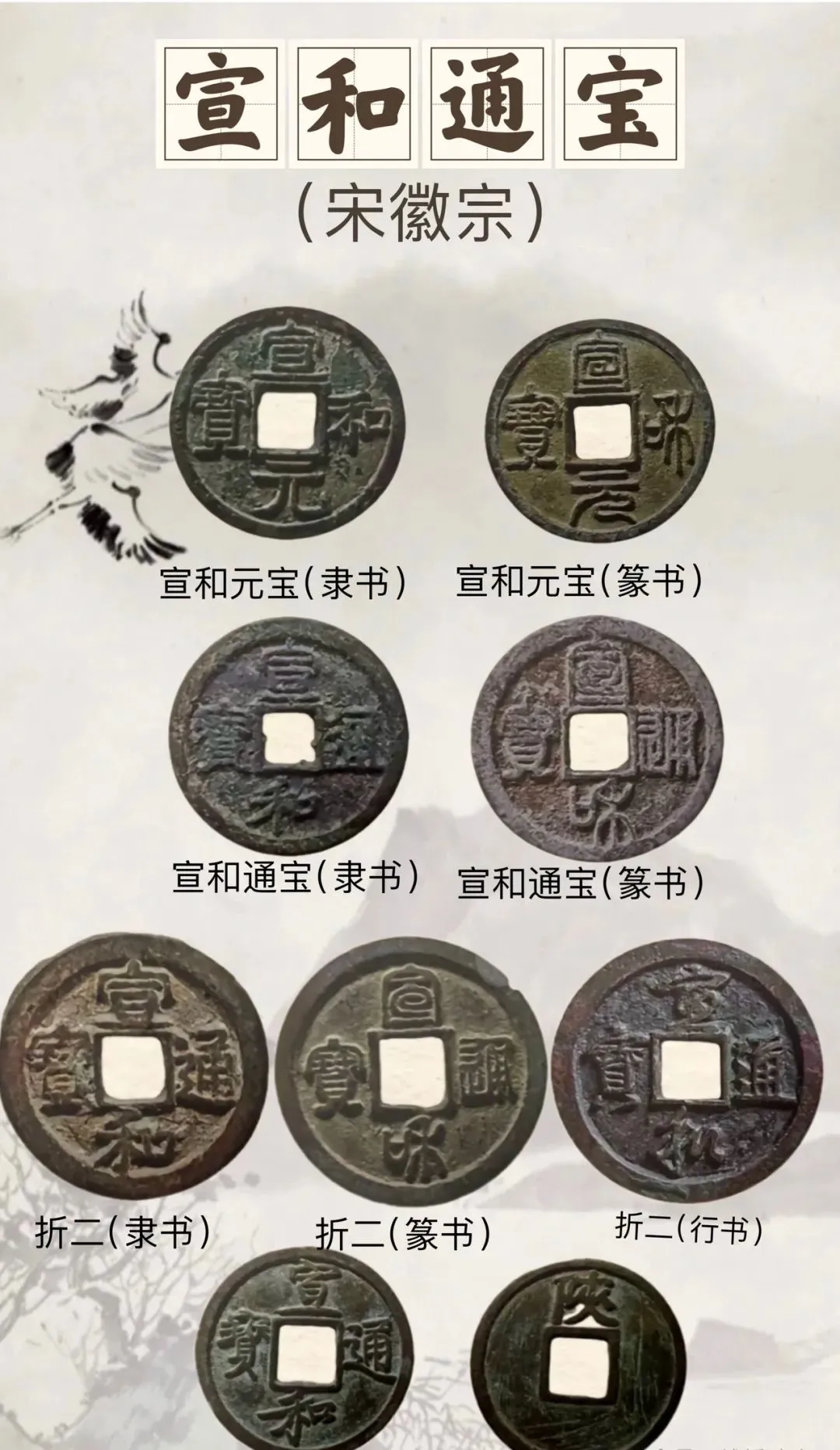 宣和通(元)宝宋徽宗宣和年间(公元1119-1125年)铸,钱文'宣和'乃皇上常处宣和殿命其年号。元宝篆隶成对铸量较少。通宝有小平、折二、折三等铜铁钱,版别复杂,多寡不一,大部分篆、隶成对。另有瘦金体背陕铜铁小平钱。靖康元年(1126年)闰十一月底金兵南下,受李纲之言,宋徽宗匆匆禅位给太子赵桓,东京之战失利,金军攻破汴京,赵佶被俘后受折磨而死,终年54岁,葬于绍兴永佑陵。