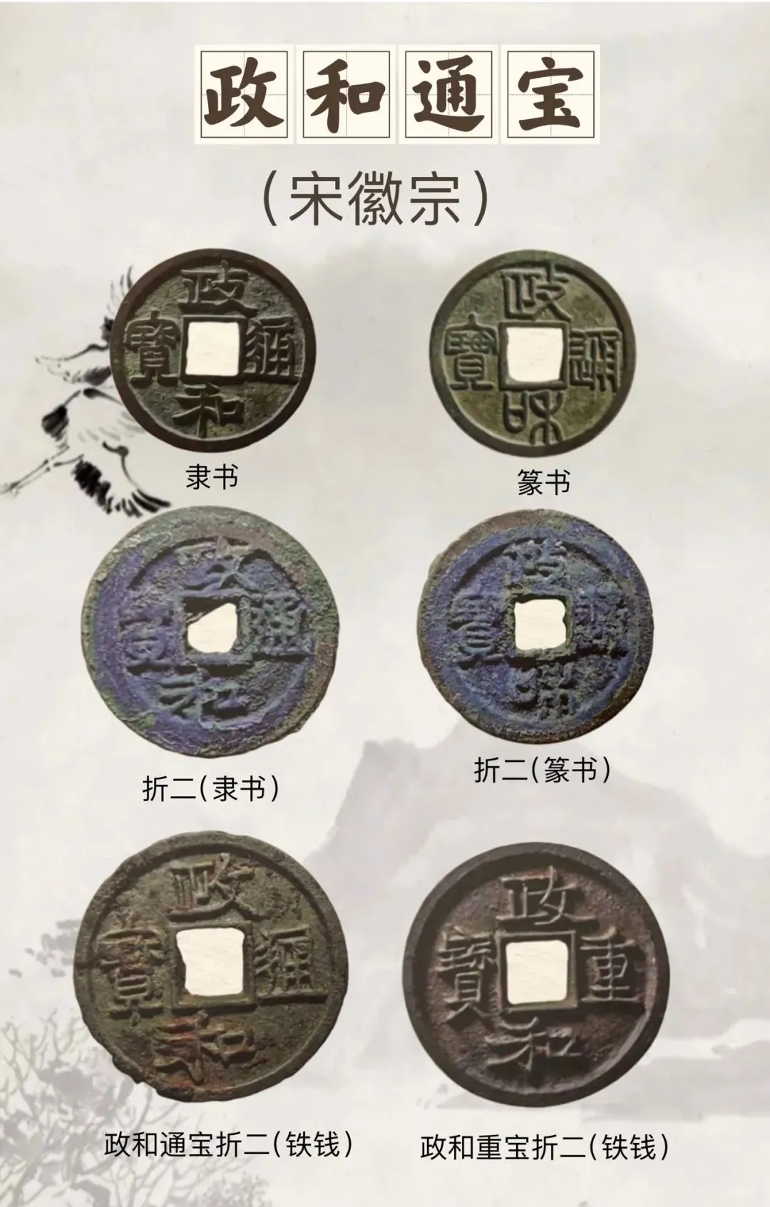 政和通(重)宝宋徽宗政和年间(1111年-1117年)铸造。政和通宝有小平,折二型铜钱及折三型铁钱,篆、隶二种书体成对,特色之处是隶书中杂有楷意,有时也称作楷书。小平铜钱存世量大,版别复杂,'政'、'通'二字变化最多。铁钱铸造量极大,存世较多。另有珍罕的银质政和通宝,古泉大珍。政和重宝为折二钱,楷书,钱文瘦金体,直读光背传世有折二、铁母数种珍品。