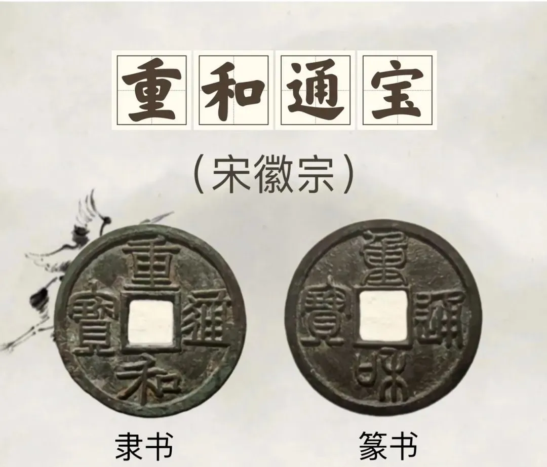 重和通宝宋徽宗赵佶重和元年(1118)始铸。面文对读,钱文端庄,铸工精良,仅小平铜钱篆、隶对品一种。因铸造期限极短,加之南北宋交替时期,战乱频繁,故此钱量少难觅,是北宋钱的名誉品。